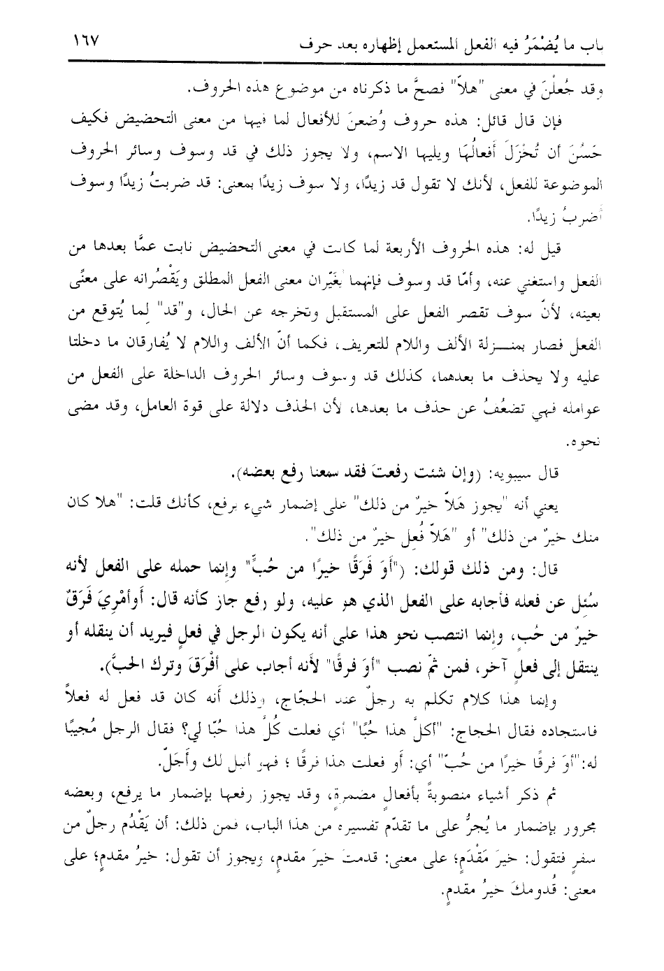 قيل له: هذه الحروف الأربعة لما كانت في معنى التحضيض نابت عمّا بعدها من الفعل واستغني عنه، وأمّا قد وسوف فإنهما يغيّر ان معنى الفعل المطلق ويقصرانه على معنى بعينه، لأنّ سوف تقصر الفعل على المستقبل وتخرجه عن الحال، و " قد " لما يتوقع من الفعل فصار بمنزلة الألف واللام للتعريف، فكما أنّ الألف واللام لا يفارقان ما دخلتا عليه ولا يحذف ما بعدهما، كذلك قد وسوف وسائر الحروف الداخلة على الفعل من عوامله فهي
