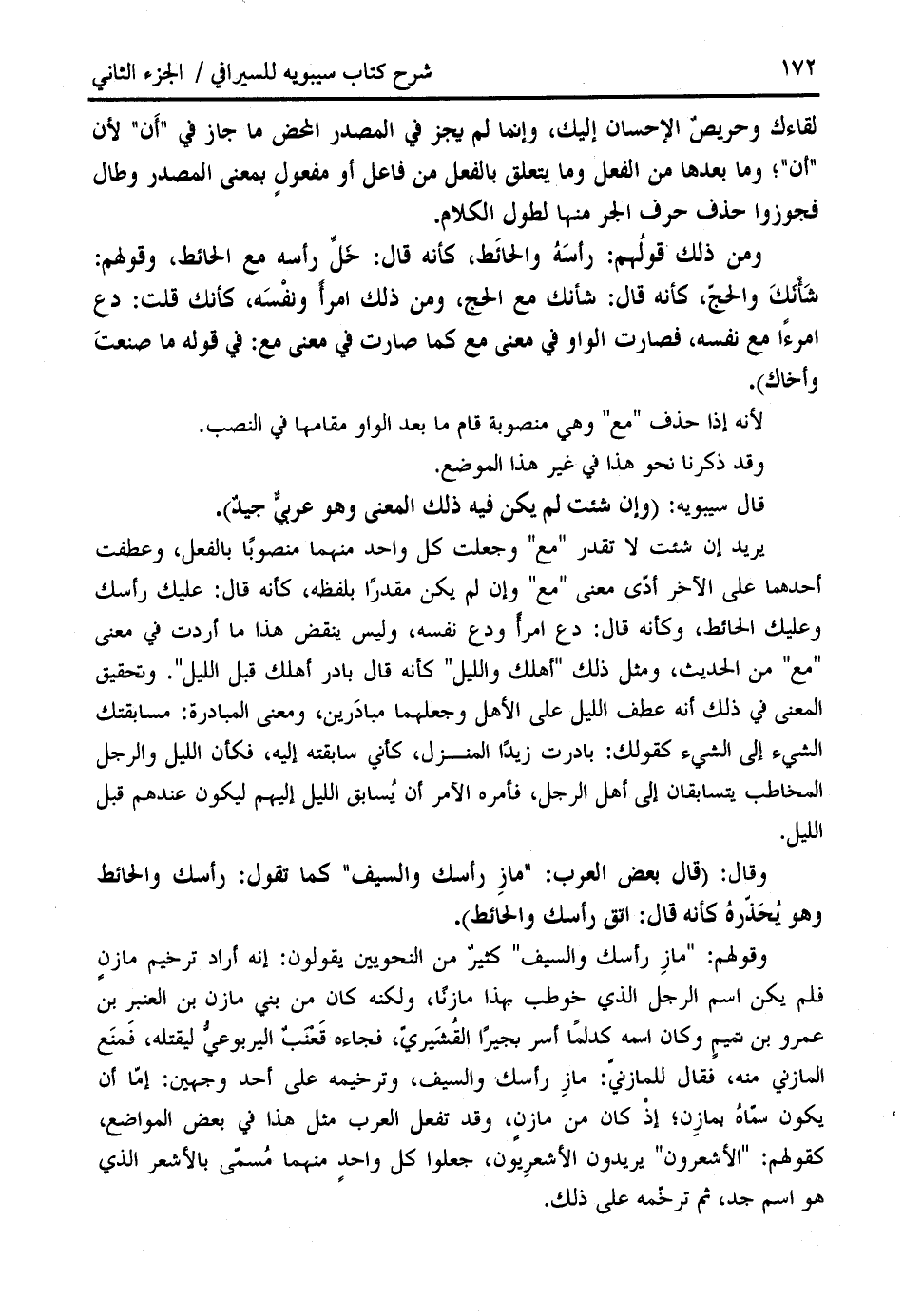 يريد إن شئت لا تقدر " مع " وجعلت كل واحد منهما منصوبا بالفعل، وعطفت أحدهما على الآخر أدّى معنى " مع " وإن لم يكن مقدرا بلفظه، كأنه قال: عليك رأسك وعليك الحائط، وكأنه قال: دع امرأ ودع نفسه، وليس ينقض هذا ما أردت في معنى " مع " من الحديث، ومثل ذلك " أهلك والليل " كأنه قال بادر أهلك قبل الليل ". وتحقيق المعنى في ذلك أنه عطف الليل على الأهل وجعلهما مبادرين، ومعنى المبادرة: مسابقتك الشيء إلى الشيء كقولك: بادرت زيدا المنزل، كأني سابقته إليه، فكأن الليل والرجل المخاطب يتسابقان إلى أهل الرجل، فأمره الآمر أن يسابق الليل إليهم ليكون عندهم قبل الليل.