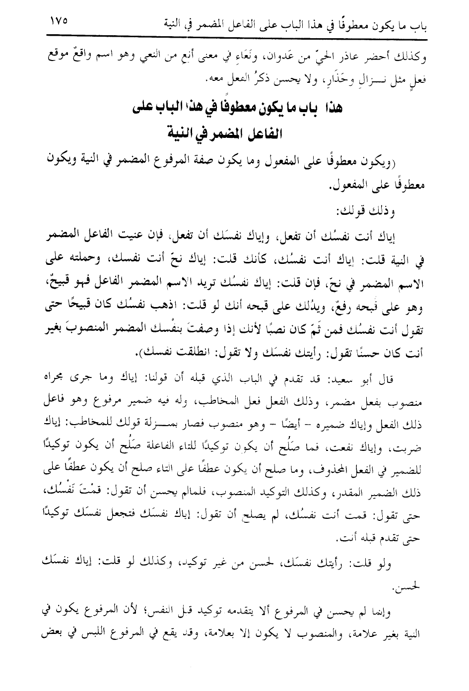 إياك أنت نفسك أن تفعل، وإياك نفسك أن تفعل، فإن عنيت الفاعل المضمر في النية قلت: إياك أنت نفسك، كأنك قلت: إياك نحّ أنت نفسك، وحملته على الاسم المضمر في نحّ، فإن قلت: إياك نفسك تريد الاسم المضمر الفاعل فهو قبيح، وهو على قبحه رفع، ويدلك على قبحه أنك لو قلت: اذهب نفسك كان قبيحا حتى تقول أنت نفسك فمن ثمّ كان نصبا لأنك إذا وصفت بنفسك المضمر المنصوب بغير أنت كان حسنا تقول: رأيتك نفسك ولا تقول: انطلقت نفسك).