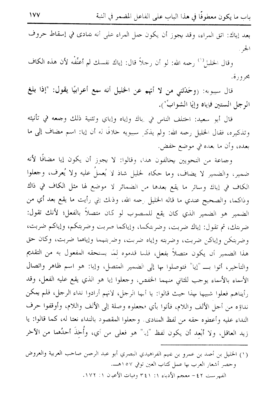 وجماعة من النحويين يخالفون هذا، وقالوا: لا يجوز أن يكون إيا مضافا لأنه ضمير، والضمير لا يضاف، وما حكاه الخليل شاذ لا يعمل عليه ولا يعرف، وجعلوا الكاف في إياك وسائر ما يقع بعدها من الضمائر لا موضع لها مثل الكاف في ذاك وذاكما، والصحيح عندي ما قاله الخليل رحمه الله، وذلك إني رأيت ما يقع بعد أي من الضمير هو الضمير الذي كان يقع للمنصوب لو كان متصلا بالفعل؛ لأنك تقول: