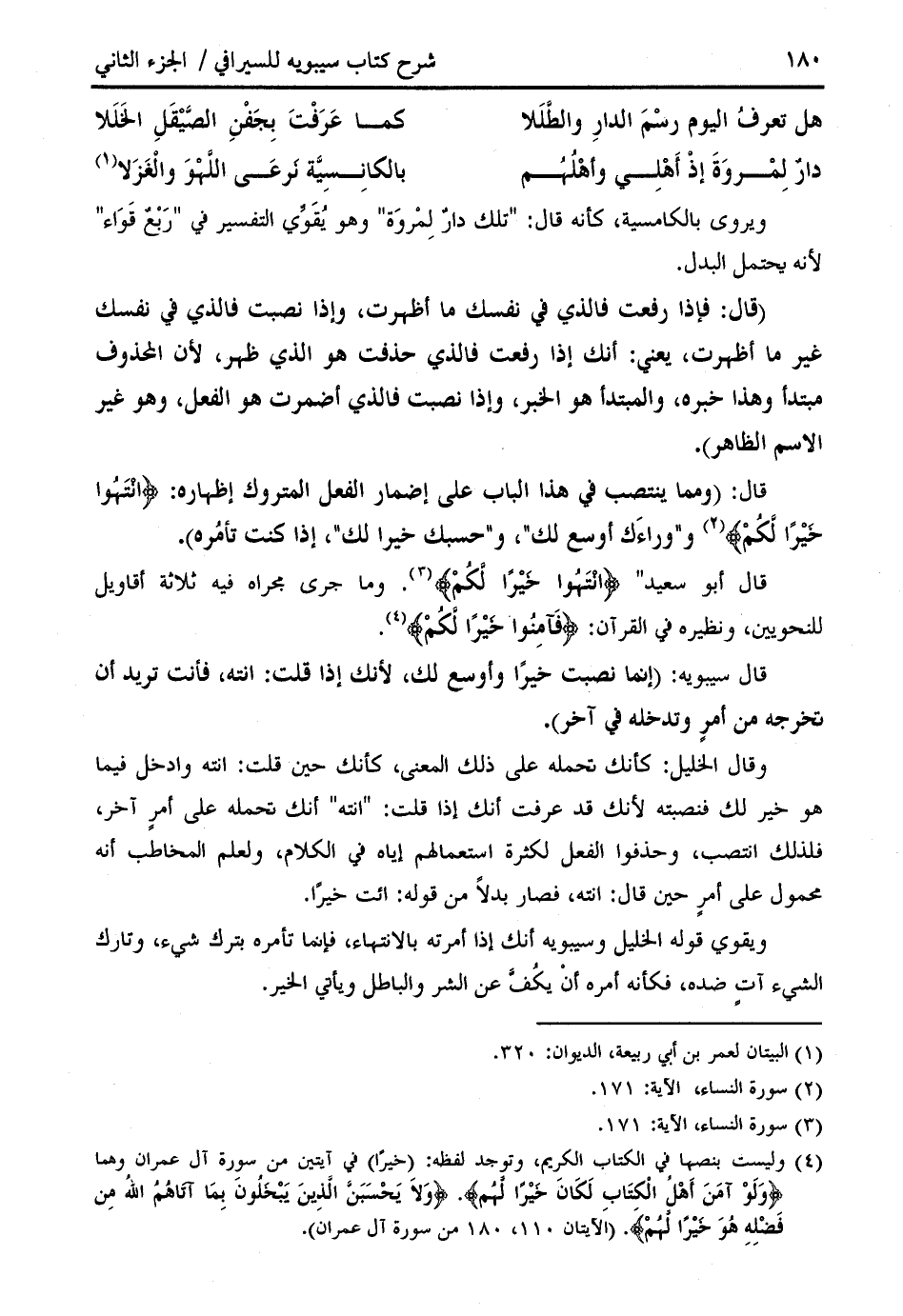 وقال الخليل: كأنك تحمله على ذلك المعنى، كأنك حين قلت: انته وادخل فيما هو خير لك فنصبته لأنك قد عرفت أنك إذا قلت: " انته " أنك تحمله على أمر آخر، فلذلك انتصب، وحذفوا الفعل لكثرة استعمالهم إياه في الكلام، ولعلم المخاطب أنه محمول على أمر حين قال: انته، فصار بدلا من قوله: ائت خيرا.
