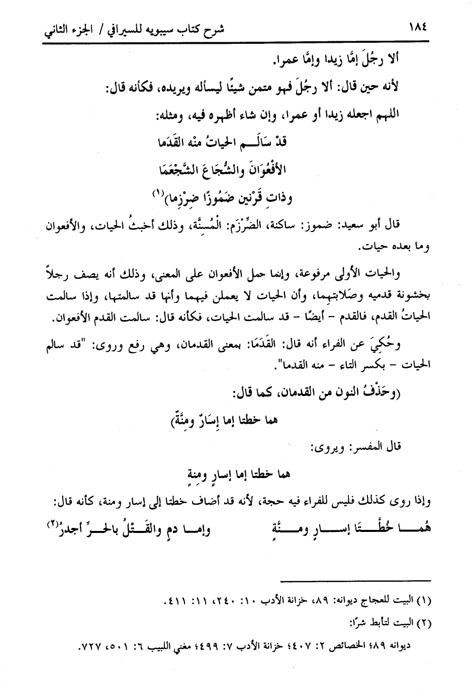 والحيات الأولى مرفوعة، وإنما حمل الأفعوان على المعنى، وذلك أنه يصف رجلا بخشونة قدميه وصلابتهما، وأن الحيات لا يعملن فيهما وأنها قد سالمتها، وإذا سالمت الحيات القدم، فالقدم- أيضا- قد سالمت الحيات، فكأنه قال: سالمت القدم الأفعوان.