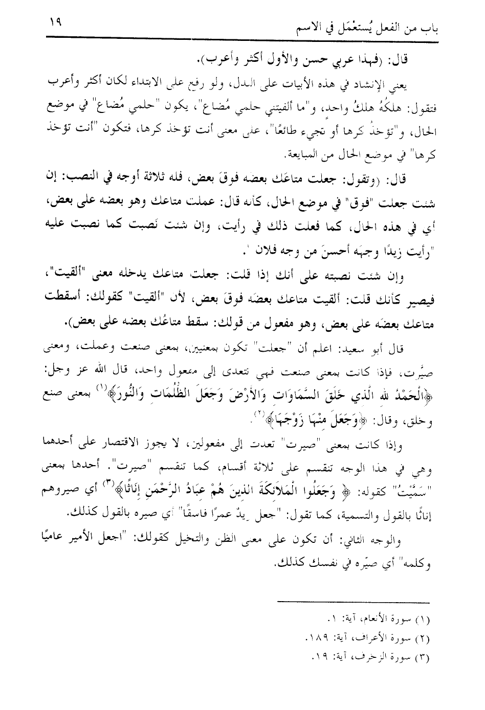 وإذا كانت بمعنى " صيرت " تعدت إلى مفعولين، لا يجوز الاقتصار على أحدهما وهي في هذا الوجه تنقسم على ثلاثة أقسام، كما تنقسم " صيرت ". أحدها بمعنى " سمّيت " كقوله: وَجَعَلُوا الْمَلائِكَةَ الَّذِينَ هُمْ عِبادُ الرَّحْمنِ إِناثاً (¬3) أي صيروهم إناثا بالقول والتسمية، كما تقول: " جعل زيد عمرا فاسقا " أي صيره بالقول كذلك.