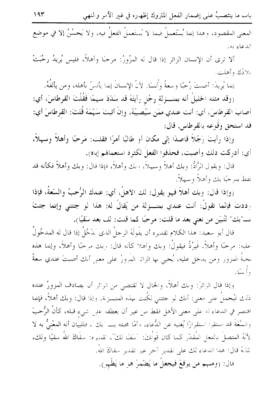ألا ترى أن الإنسان الزائر إذا قال له المزور: مرحبا وأهلا، فليس يريد رحبت بلادك وأهلت.