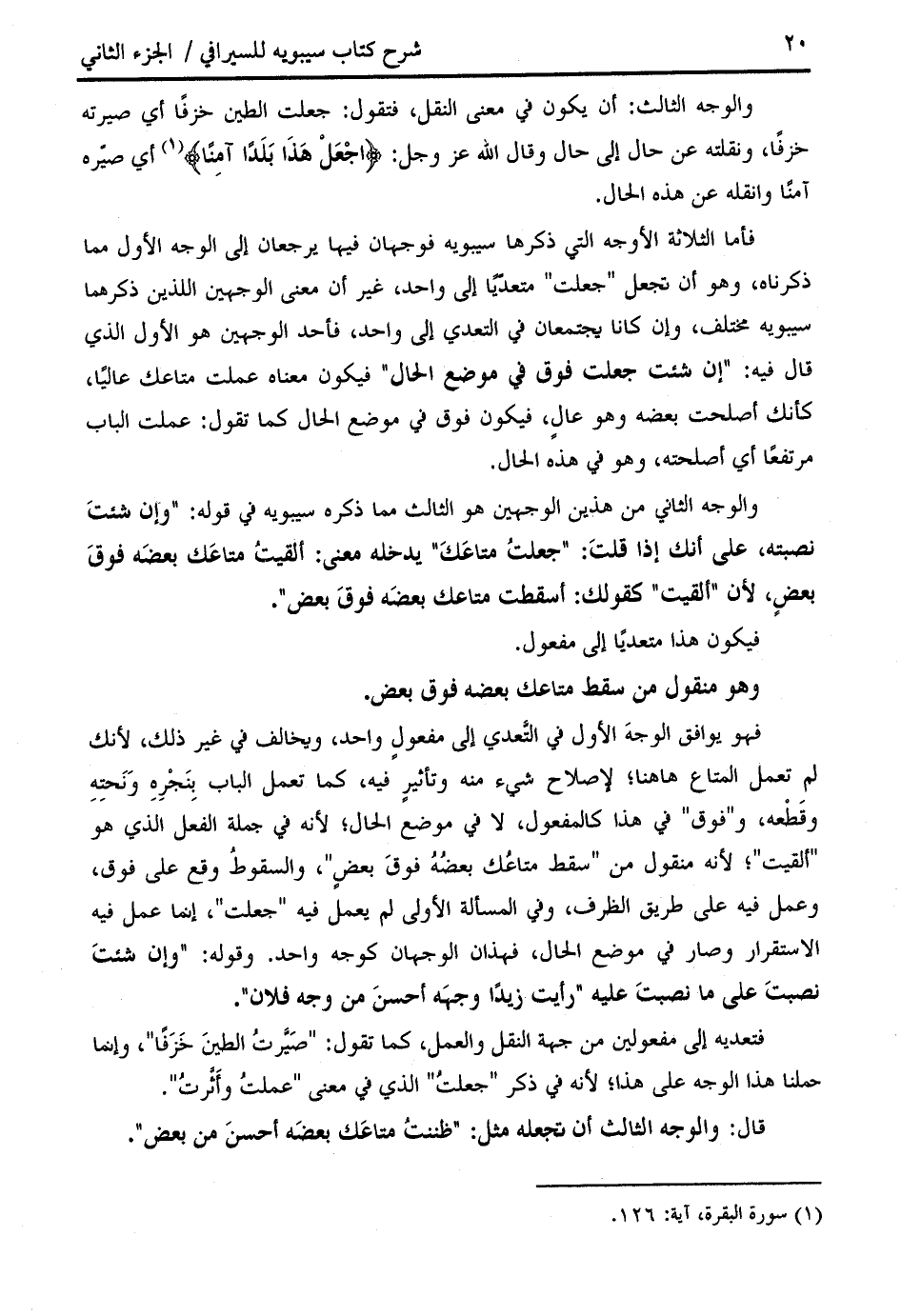 والوجه الثالث: أن يكون في معنى النقل، فتقول: جعلت الطين خزفا أي صيرته خزفا، ونقلته عن حال إلى حال وقال الله عز وجل: اجْعَلْ هذا بَلَداً آمِناً (¬1) أي صيّره آمنا وانقله عن هذه الحال.