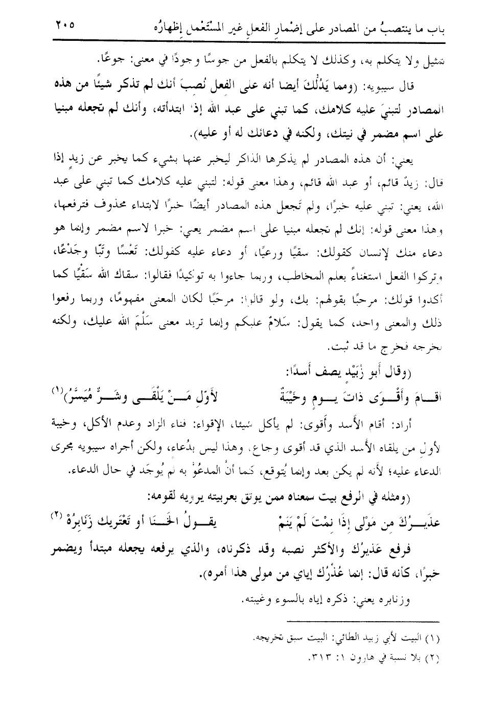 قال سيبويه: (ومما يدلّك أيضا أنه على الفعل نصب أنك لم تذكر شيئا من هذه المصادر لتبني عليه كلامك، كما تبني على عبد الله إذا ابتدأته، وأنك لم تجعله مبنيا على اسم مضمر في نيتك، ولكنه في دعائك له أو عليه).