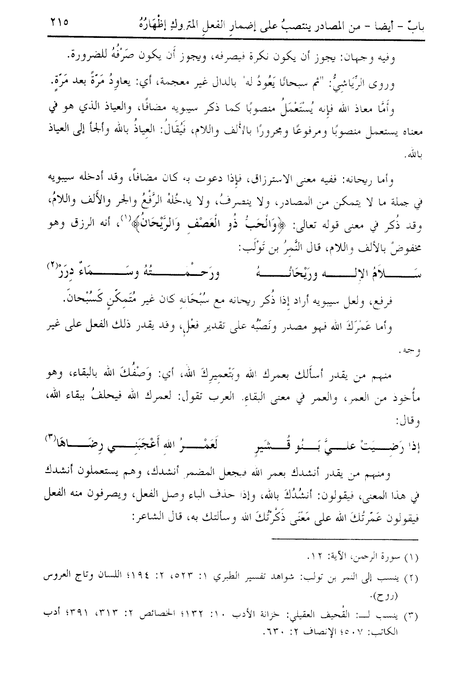 وأما ريحانه: ففيه معنى الاسترزاق، فإذا دعوت به كان مضافا، وقد أدخله سيبويه في جملة ما لا يتمكن من المصادر، ولا ينصرف، ولا يدخله الرّفع والجر والألف واللام، وقد ذكر في معنى قوله تعالى: وَالْحَبُّ ذُو الْعَصْفِ وَالرَّيْحانُ (¬1)، أنه الرزق وهو مخفوض بالألف واللام، قال النّمر بن تولب: