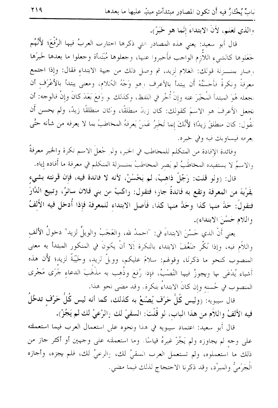 قال أبو سعيد: يعني هذه المصادر التي ذكرها اختارت العرب فيها الرّفع؛ لأنّهم جعلوها كالشيء اللّازم الواجب فأخبروا عنها، وجعلوها مبتدأة وجعلوا ما بعدها خبرها وصار بمنزلة قولك: الغلام لزيد، ثم وصل ذلك من جهة الابتداء فقال: وإذا اجتمع معرفة ونكرة فأحسنه أن يبتدأ بالأعرف وهو وجه الكلام، ومعنى يبتدأ بالأعرف أن تجعله هو المبتدأ المخبر عنه وإن أخّر في اللفظ، وكذلك لو وقع بعد كان وإنّ فالوجه: أن تجعل الأعرف هو الاسم كقولك: كان زيد منطلقا، وكان منطلقا زيد، ولم يحسن أن تقول: كان منطلق زيدا؛ لأنّك إنما تخبر عمّن يعرفه المخاطب بما لا يعرفه من شأنه حتّى يعرفه فيساويك فيه وفي خبره.