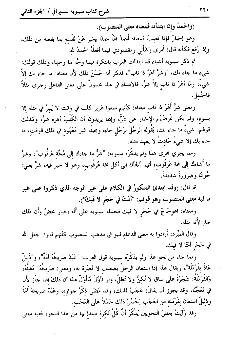 ثم قال: (وقد ابتدئ المنكور في الكلام على غير الوجه الذي ذكروا على غير ما فيه معنى المنصوب وهو قولهم: " أمت في حجر لا فيك ").