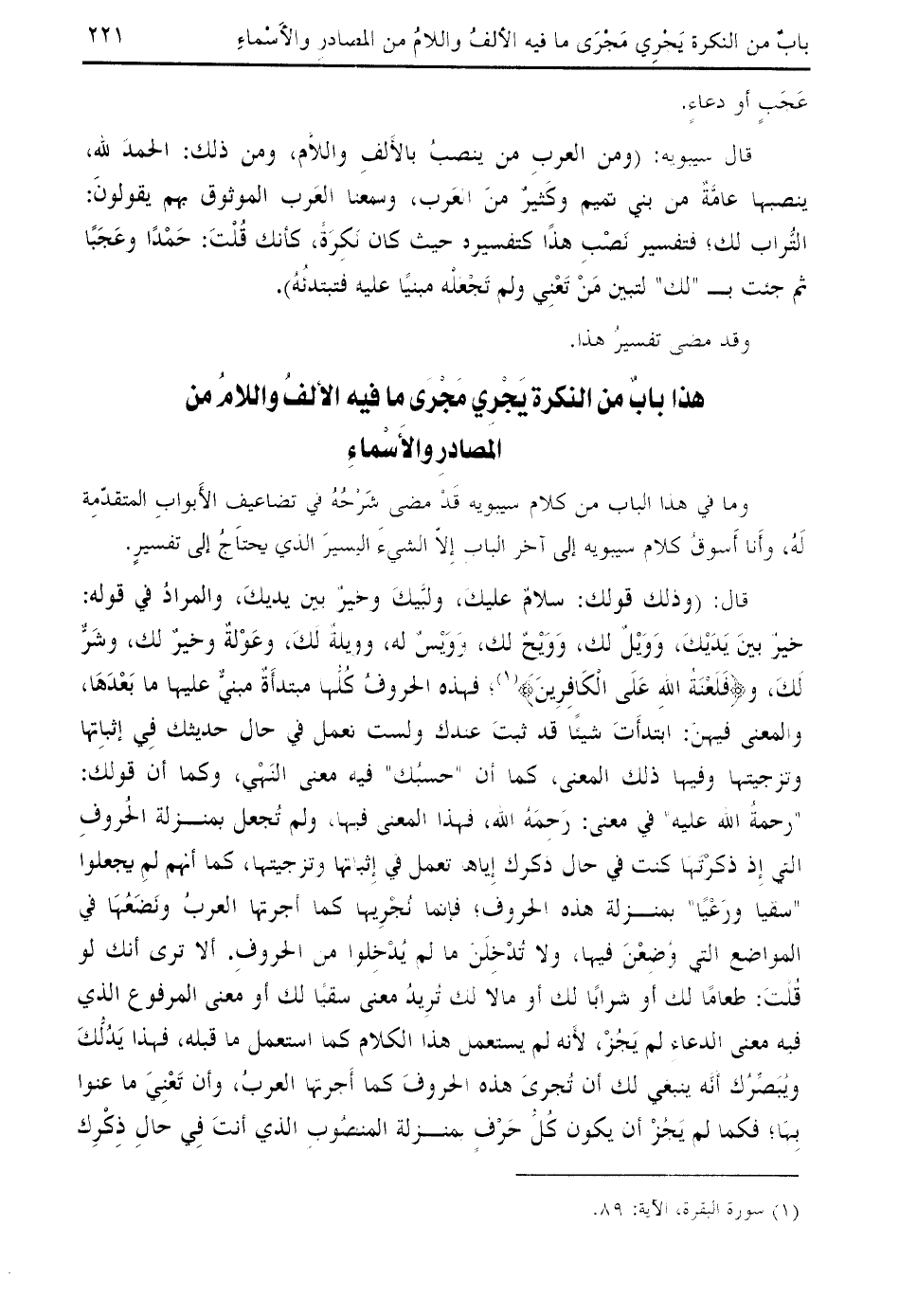وما في هذا الباب من كلام سيبويه قد مضى شرحه في تضاعيف الأبواب المتقدّمة له، وأنا أسوق كلام سيبويه إلى آخر الباب إلّا الشيء اليسير الذي يحتاج إلى تفسير.
