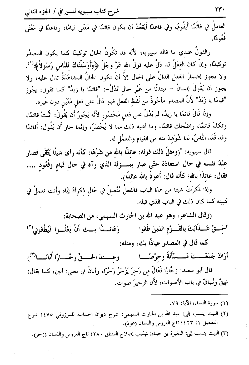 قال سيبويه: " (ومثل ذلك قوله: عائذا بالله من شرّها؛ كأنه رأى شيئا يتّقى فصار عند نفسه في حال استعاذة حتّى صار بمنزلة الذي رآه في حال قيام وقعود ....