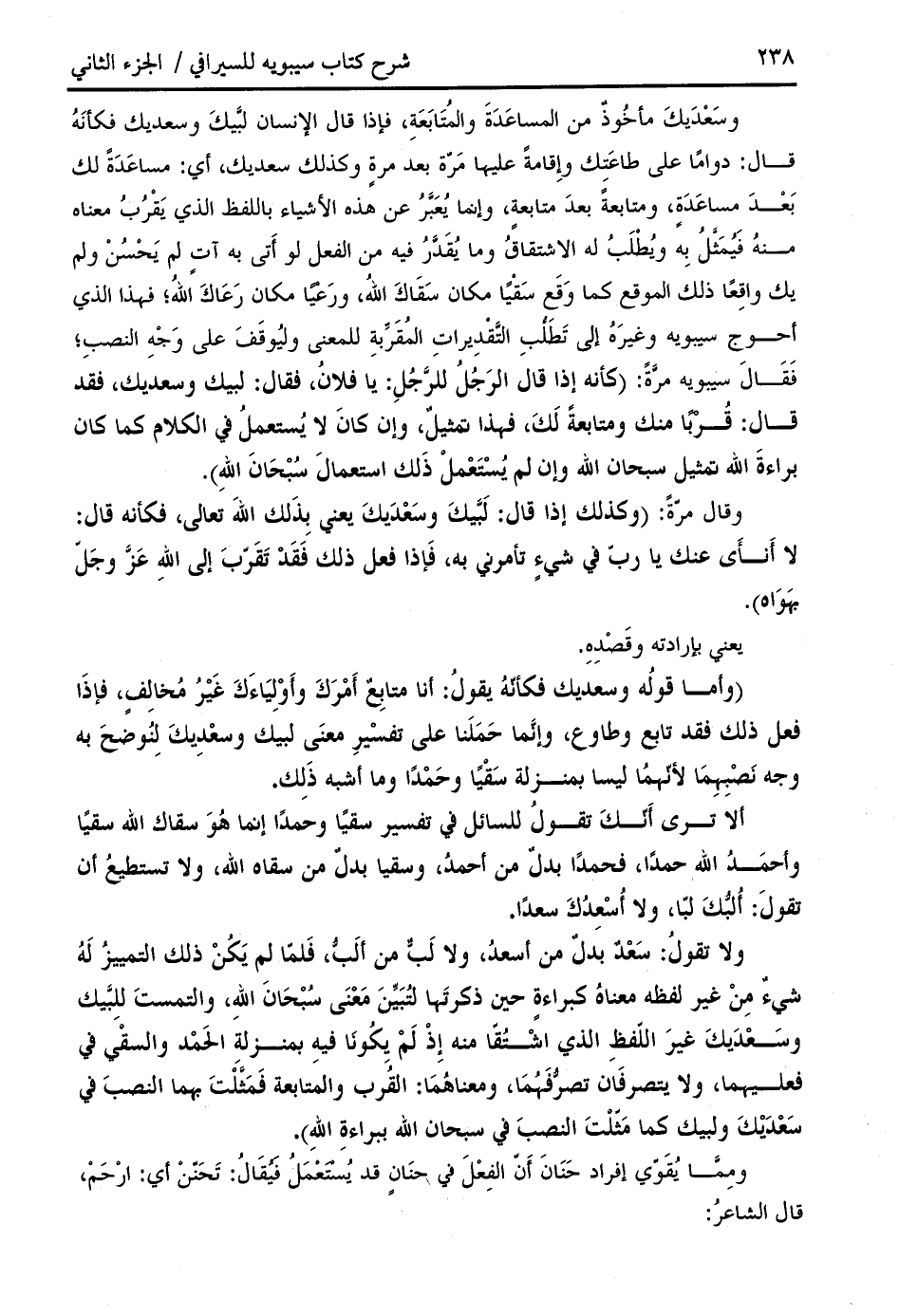 ولا تقول: سعد بدل من أسعد، ولا لبّ من ألبّ، فلمّا لم يكن ذلك التمييز له شيء من غير لفظه معناه كبراءة حين ذكرتها لتبيّن معنى سبحان الله، والتمست للبّيك وسعديك غير اللّفظ الذي اشتقّا منه إذ لم يكونا فيه بمنزلة الحمد والسقي في فعليهما، ولا يتصرفان تصرّفهما، ومعناهما: القرب والمتابعة فمثّلت بهما النصب في سعديك ولبيك كما مثّلت النصب في سبحان الله ببراءة الله).