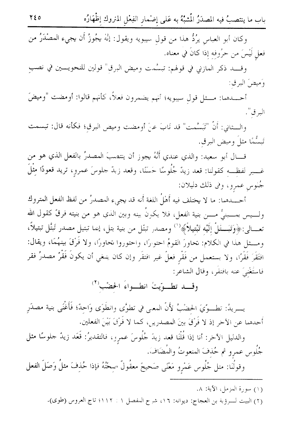 أحدهما: ما لا يختلف فيه أهل اللغة أنه قد يجيء المصدر من لفظ الفعل المتروك وليس بمبنيّ من بنية الفعل، فلا يكون بينه وبين الذي هو من بنيته فرق كقول الله تعالى: وَتَبَتَّلْ إِلَيْهِ تَبْتِيلًا (¬1) ومصدر تبتّل من بنية بتل، إنما تبتيل مصدر تبتّل تبتيلا، ومثل هذا في الكلام: تحاور القوم احتوارا، واحتوروا تحاورا، ولا فرق بينهما، ويقال: