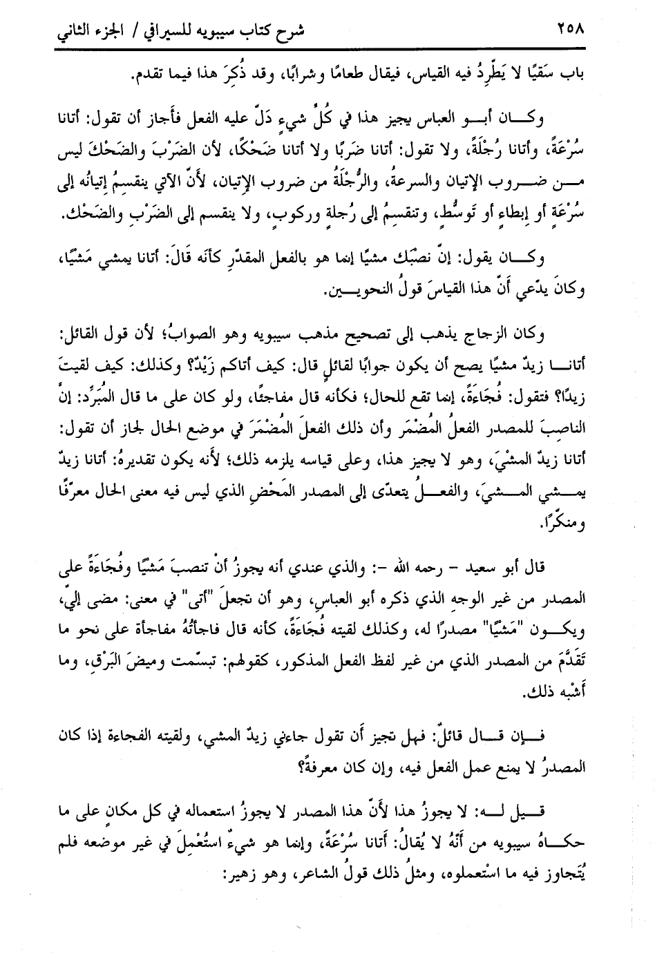 وكان أبو العباس يجيز هذا في كلّ شيء دلّ عليه الفعل فأجاز أن تقول: أتانا سرعة، وأتانا رجلة، ولا تقول: أتانا ضربا ولا أتانا ضحكا، لأن الضرب والضحك ليس من ضروب الإتيان والسرعة، والرّجلة من ضروب الإتيان، لأنّ الآتي ينقسم إتيانه إلى سرعة أو إبطاء أو توسّط، وتنقسم إلى رجلة وركوب، ولا ينقسم إلى الضرب والضحك.