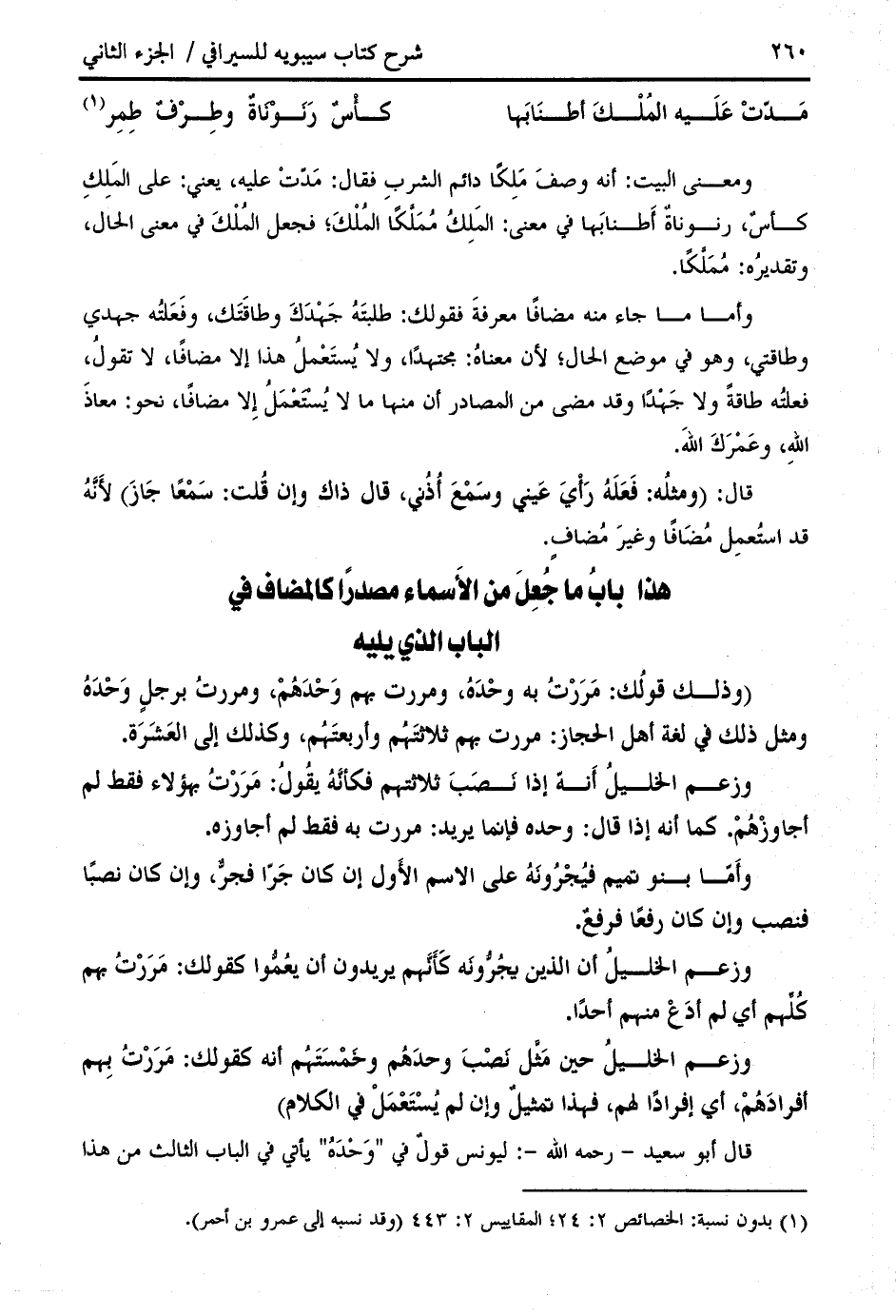 (وذلك قولك: مررت به وحده، ومررت بهم وحدهم، ومررت برجل وحده ومثل ذلك في لغة أهل الحجاز: مررت بهم ثلاثتهم وأربعتهم، وكذلك إلى العشرة.