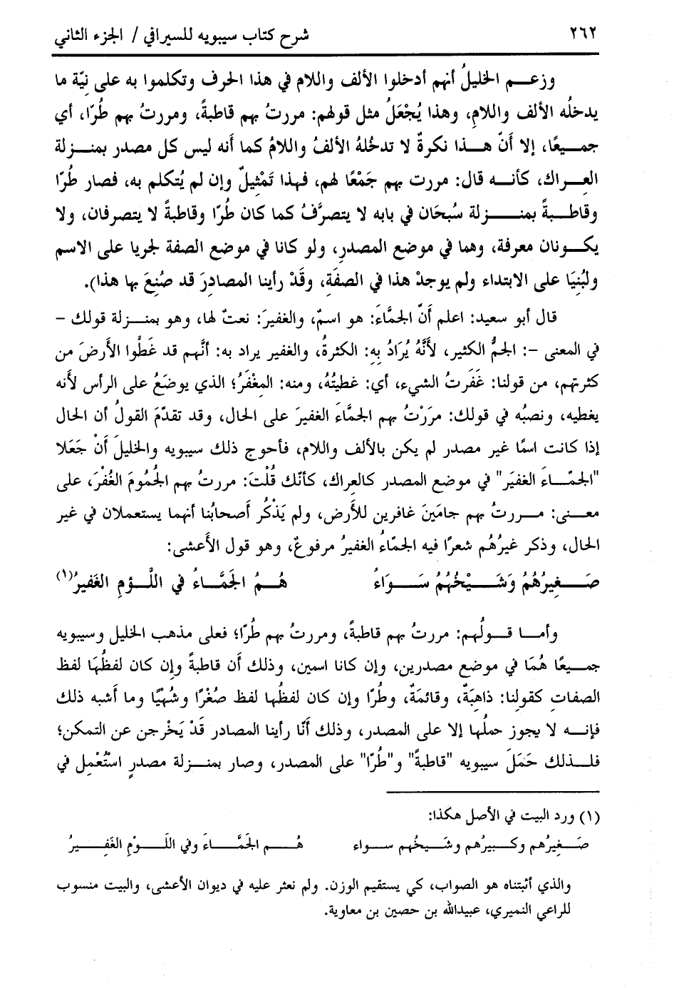 قال أبو سعيد: اعلم أنّ الجمّاء: هو اسم، والغفير: نعت لها، وهو بمنزلة قولك- في المعنى-: الجمّ الكثير، لأنّه يراد به: الكثرة، والغفير يراد به: أنّهم قد غطّوا الأرض من كثرتهم، من قولنا: غفرت الشيء، أي: غطيته، ومنه: المغفر؛ الذي يوضع على الرأس لأنه يغطيه، ونصبه في قولك: مررت بهم الجمّاء الغفير على الحال، وقد تقدّم القول أن الحال إذا كانت اسما غير مصدر لم يكن بالألف واللام، فأحوج ذلك سيبويه والخليل أن جعلا " الجمّاء الغفير " في