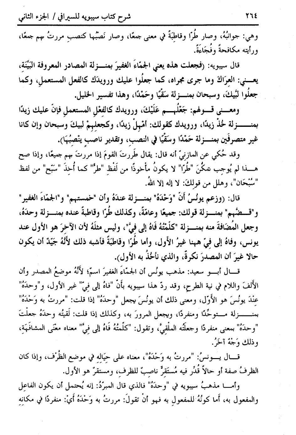 قال: (وزعم يونس أنّ " وحده " بمنزلة عنده وأن " خمستهم " و " الجمّاء الغفير " و " قضّهم " بمنزلة قولك: جميعا وعامّة، وكذلك طرّا وقاطبة عنده بمنزلة وحده، وجعل المضافة منه بمنزلة " كلّمته فاه إلى فيّ "، وليس مثله لأن الآخر هو الأول عند يونس، وفاه إلى فيّ ههنا غير الأول، وأما طرّا وقاطبة فأشبه ذلك لأنّه جيّد أن يكون حالا غير أن المصدر نكرة، والذي نأخذ به الأول).