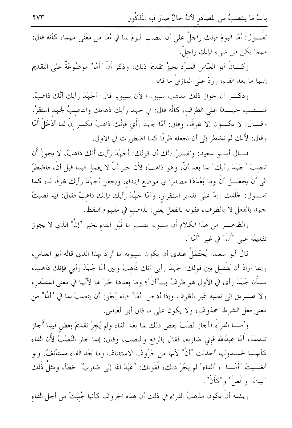 قال أبو سعيد: يحتمل عندي أن يكون سيبويه ما أراد بهذا الذي قاله أبو العباس، وإنما أراد أن يفصل بين قولك: جهد رأيي أنك ذاهب وبين أمّا جهد رأيي فإنك ذاهب، بأن جهد رأى في الأول هو ظرف ب " أنّ "؛ وما بعدها خبر لها لأنّها في معنى المصدر، ولا طريق إلى نصبه غير الظرف وإذا أدخل " أمّا " فإنه يجوز أن ينصب بما في " أمّا " من معنى فعل الشرط المحذوف، ولا يكون على ما قال أبو العباس.