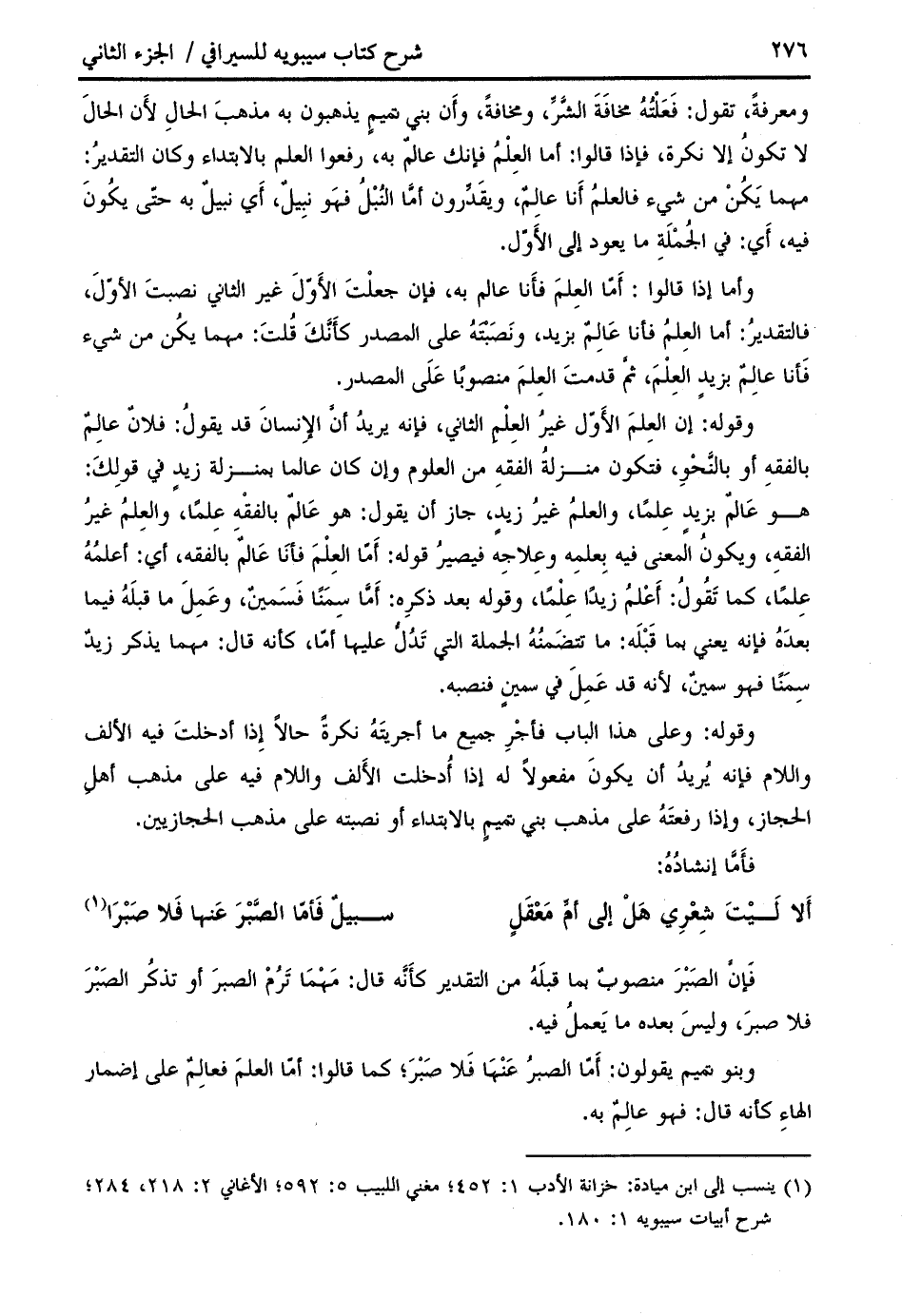ومعرفة، تقول: فعلته مخافة الشّرّ، ومخافة، وأن بني تميم يذهبون به مذهب الحال لأن الحال لا تكون إلا نكرة، فإذا قالوا: أما العلم فإنك عالم به، رفعوا العلم بالابتداء وكان التقدير: