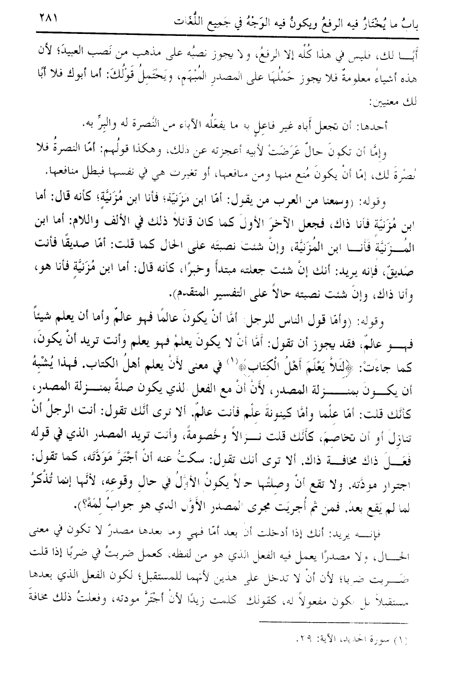 وقوله: (وأمّا قول الناس للرجل: أمّا أن يكون عالما فهو عالم وأما أن يعلم شيئا فهو عالم، فقد يجوز أن تقول: أمّا أن لا يكون يعلم فهو يعلم وأنت تريد أن يكون، كما جاءت: لِئَلَّا يَعْلَمَ أَهْلُ الْكِتابِ (¬1) في معنى لأن يعلم أهل الكتاب. فهذا يشبه أن يكون بمنزلة المصدر، لأنّ أن مع الفعل الذي يكون صلة بمنزلة المصدر، كأنّك قلت: أمّا علما وأمّا كينونة علم فأنت عالم. ألا ترى أنّك تقول: أنت الرجل أن تنازل أو أن تخاصم، كأنّك قلت نزالا وخصومة، وأنت تريد المصدر الذي في قوله فعل ذاك مخافة ذاك. ألا ترى أنك تقول: سكتّ عنه أن أجترّ مودّته، كما تقول: