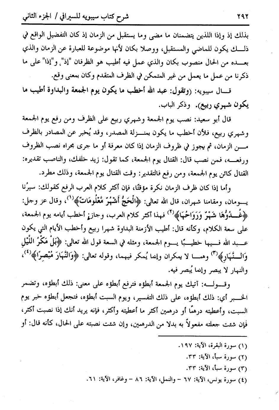 وأما إذا كان ظرف الزمان نكرة مؤقتا، فإن أكثر كلام العرب الرفع كقولك: سيرنا يومان، ومقامنا شهران، قال الله تعالى: الْحَجُّ أَشْهُرٌ مَعْلُوماتٌ (¬1)، وقال عز وجل: