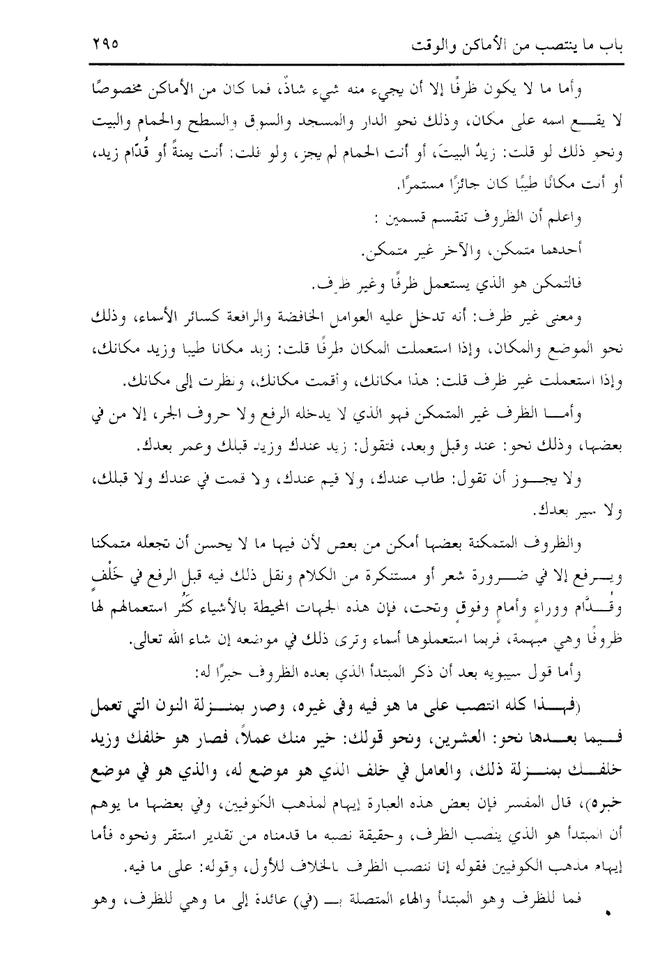 (فهذا كله انتصب على ما هو فيه وفي غيره، وصار بمنزلة النون التي تعمل فيما بعدها نحو: العشرين، ونحو قولك: خير منك عملا، فصار هو خلفك وزيد خلفك بمنزلة ذلك، والعامل في خلف الذي هو موضع له، والذي هو في موضع خبره)، قال المفسر فإن بعض هذه العبارة إيهام لمذهب الكوفيين، وفي بعضها ما يوهم أن المبتدأ هو الذي ينصب الظرف، وحقيقة نصبه ما قدمناه من تقدير استقر ونحوه فأما إيهام مذهب الكوفيين فقوله إنا ننصب الظرف بالخلاف للأول، وقوله: على ما فيه.