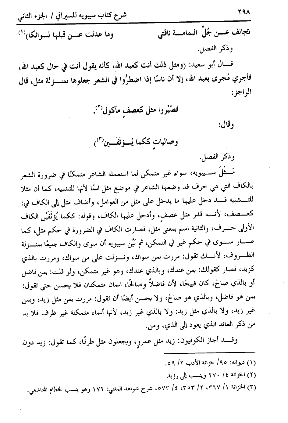 كعصف، لأنه قدر مثل عصف، وأدخل عليها الكاف، وقوله: ككما يؤثفين الكاف الأولى حرف، والثانية اسم بمعنى مثل، فصارت الكاف في الضرورة في حكم مثل، كما صار سوى في حكم غير في التمكن، ثم بيّن سيبويه أن سوى والكاف جميعا بمنزلة الظروف، لأنك تقول: مررت بمن سواك، ونزلت على من سواك، ومررت بالذي كزيد، فصار كقولك: بمن عندك، وبالذي عندك، وهو غير متمكن، ولو قلت: بمن فاضل أو بالذي صالح، كان قبيحا، لأن