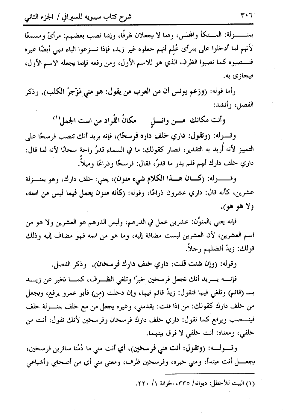فإنه يريد أنك تجعل فرسخين خبرا وتلغي الظرف، كما تخبر عن زيد ب (قائم) وتلغي فيها فتقول: زيد قائم فيها، وإن دخلت (من) فأبو عمرو يرفع، ويجعل من خلف دارك كقولك: من إذا قلت: يقدمني، وغيره يجعل من مع خلف بمنزلة خلف فينصب ويرفع كما تقول: داري خلف دارك فرسخان وفرسخين لأنك تقول: أنت من خلفي، ومعناه: أنت خلفي لا فرق بينهما.