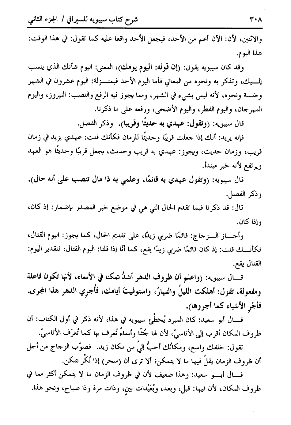 قال أبو سعيد: كان المبرد يخطّئ سيبويه في هذا، لأنه ذكر في أول الكتاب: أن ظروف المكان أقرب إلى الأناسيّ، لأن لها جثثا وأسماء تعرف بها كما تعرف الأناسيّ.