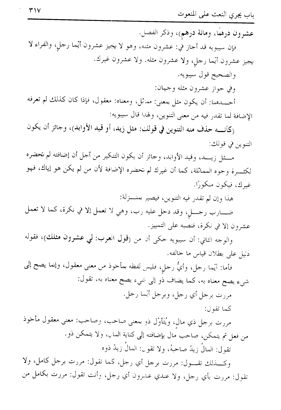 فإن سيبويه قد أجاز في: عشرون مثله، وهو لا يجيز عشرون أيّما رجل، والفراء لا يجيز عشرون أيّما رجل، ولا عشرون مثله، ولا عشرون غيرك.