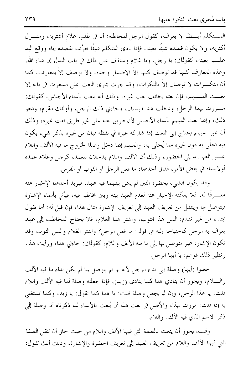 المتكلم أيضا لا يعرف، كقول الرجل لمخاطبه: أنا في طلب غلام أشتريه، ومنزل أكتريه، ولا يكون قصده شيئا بعينه، فإذا نادى المتكلم شيئا تعرّف بقصده إياه ووقع اليد عليه بعينه، كقولك: يا رجل، ويا غلام وسنقف على ذلك في باب البدل إن شاء الله، وهذه المعارف كلها قد توصف كلها إلّا الإضمار وحده، ولا يوصف إلّا بمعارف، كما أن النكرات لا توصف إلّا بالنكرات، وقد جرت مجرى النعت على المنعوت في بابه إلا نعت المبهم، فإن نعته يخالف نعت غيره، وذلك أنه ينعت بأسماء الأجناس، كقولك: