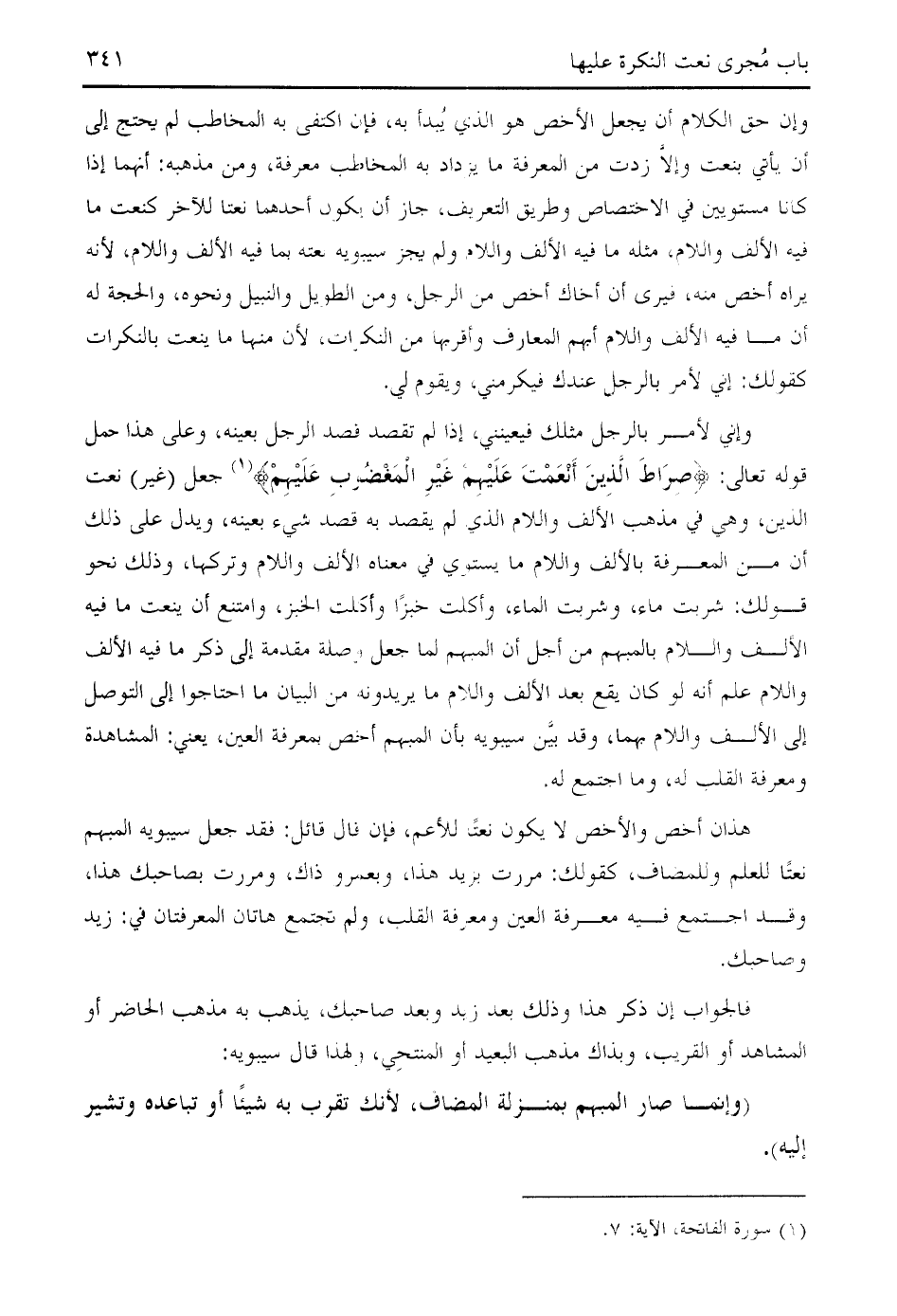 وإني لأمر بالرجل مثلك فيعينني، إذا لم تقصد قصد الرجل بعينه، وعلى هذا حمل قوله تعالى: صِراطَ الَّذِينَ أَنْعَمْتَ عَلَيْهِمْ غَيْرِ الْمَغْضُوبِ عَلَيْهِمْ (¬1) جعل (غير) نعت الذين، وهي في مذهب الألف واللام الذي لم يقصد به قصد شيء بعينه، ويدل على ذلك أن من المعرفة بالألف واللام ما يستوي في معناه الألف واللام وتركها، وذلك نحو قولك: شربت ماء، وشربت الماء، وأكلت خبزا وأكلت الخبز، وامتنع أن ينعت ما فيه الألف واللام بالمبهم من أجل أن المبهم لما جعل وصلة مقدمة إلى ذكر ما فيه الألف واللام علم أنه لو كان يقع بعد الألف واللام ما يريدونه من البيان ما احتاجوا إلى التوصل إلى الألف واللام بهما، وقد بيّن سيبويه بأن المبهم أخص بمعرفة العين، يعني: المشاهدة ومعرفة القلب له، وما اجتمع له.