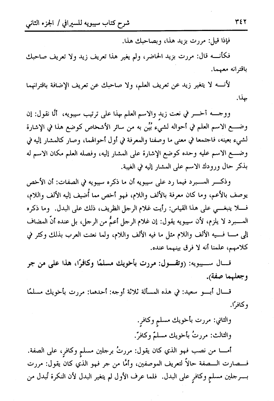 فصارت الصفة حالا لتعريف الموصفين، وأمّا من جر فهو الذي كان يقول: مررت برجلين مسلم وكافر على البدل. فلما عرف الأول لم يتغير البدل لأن النكرة تبدل من