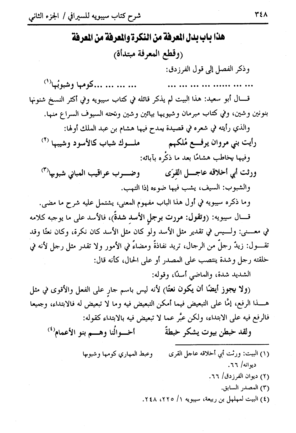 قال أبو سعيد: هذا البيت لم يذكر قائله في كتاب سيبويه وفي أكثر النسخ شنونها بنونين وشين، وفي كتاب مبرمان وشيويها بيائين وشين وتحته السيوف السراع منها.