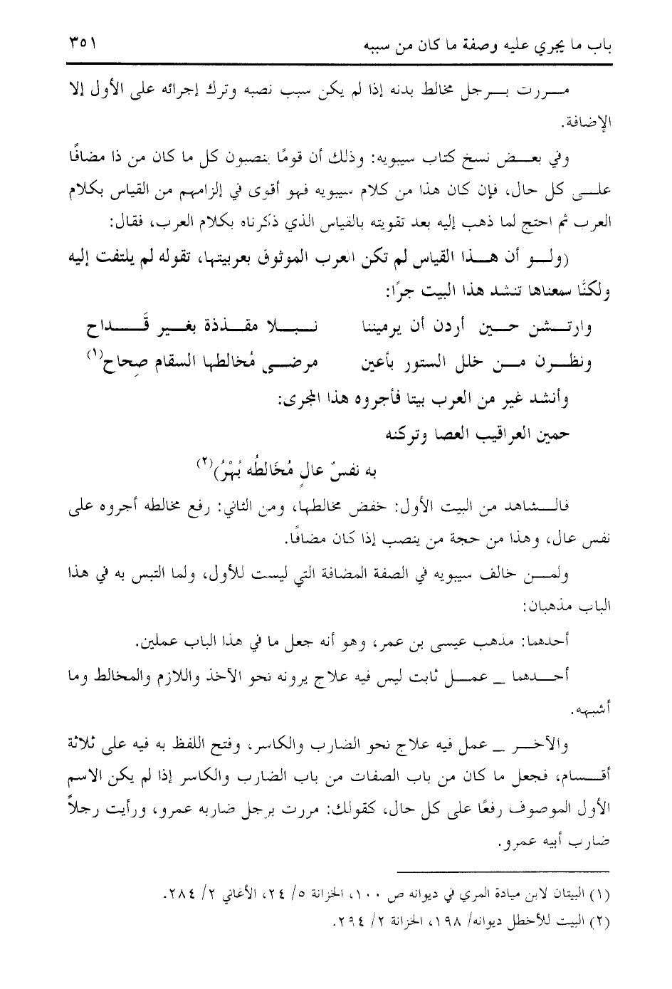 فالشاهد من البيت الأول: خفض مخالطها، ومن الثاني: رفع مخالطه أجروه على نفس عال، وهذا من حجة من ينصب إذا كان مضافا.