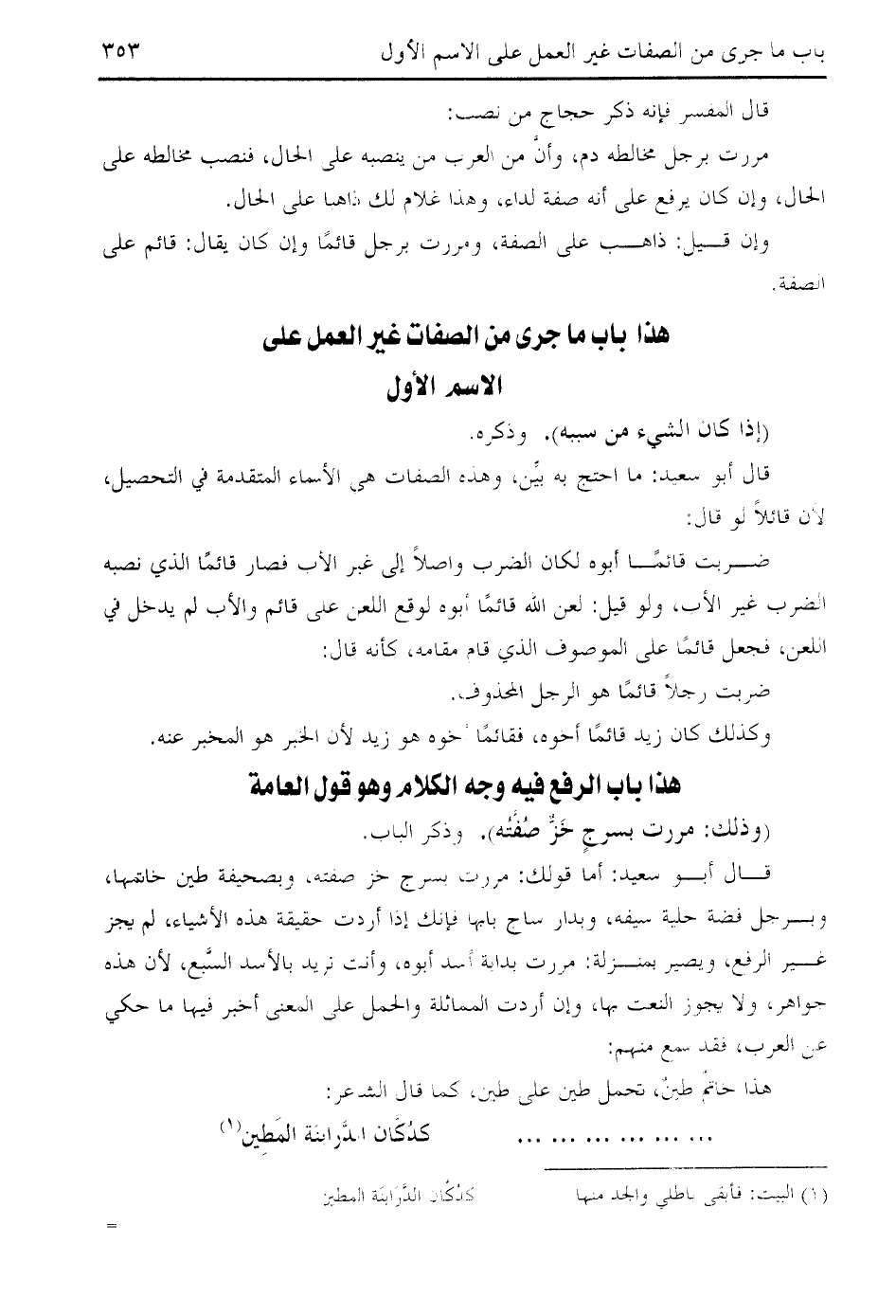 قال أبو سعيد: أما قولك: مررت بسرج خز صفته، وبصحيفة طين خاتمها، وبرجل فضة حلية سيفه، وبدار ساج