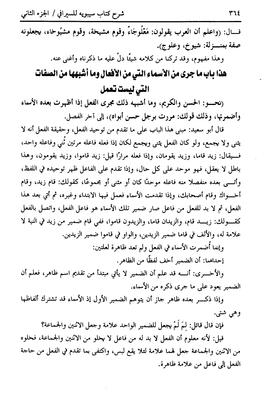 قال أبو سعيد: مبنى هذا الباب على ما تقدم من توحيد الفعل، وحقيقة الفعل أنه لا يثنى ولا يجمع، ولو كان الفعل يثنى ويجمع لكان إذا فعله فاعله مرتين ثني وفاعله واحد، فيقال: زيد قاما، وزيد يقومان، وإذا فعله مرارا قيل: زيد قاموا، وزيد يقومون، وهذا باطل لا يعقل، فهو موحد على كل حال، وإذا تقدم على الفاعل ظهر توحيده في اللفظ، وأتى بعده منفصلا منه فاعله موحدا كان أو مثنى أو مجموعا، كقولك: قام زيد، وقام أخواك وقام أصحابك، وإذا تقدمت الأسماء فعمل فيها الابتداء وغيره، ثم أتي بعد هذا الفعل، ثم لا بد للفعل من فاعل صار ضمير تلك الأسماء هو فاعل الفعل، واتصل بالفعل كقولك: زيد قام، والزيدان قاما، والزيدون قاموا، ففي قام ضمير من زيد في النية