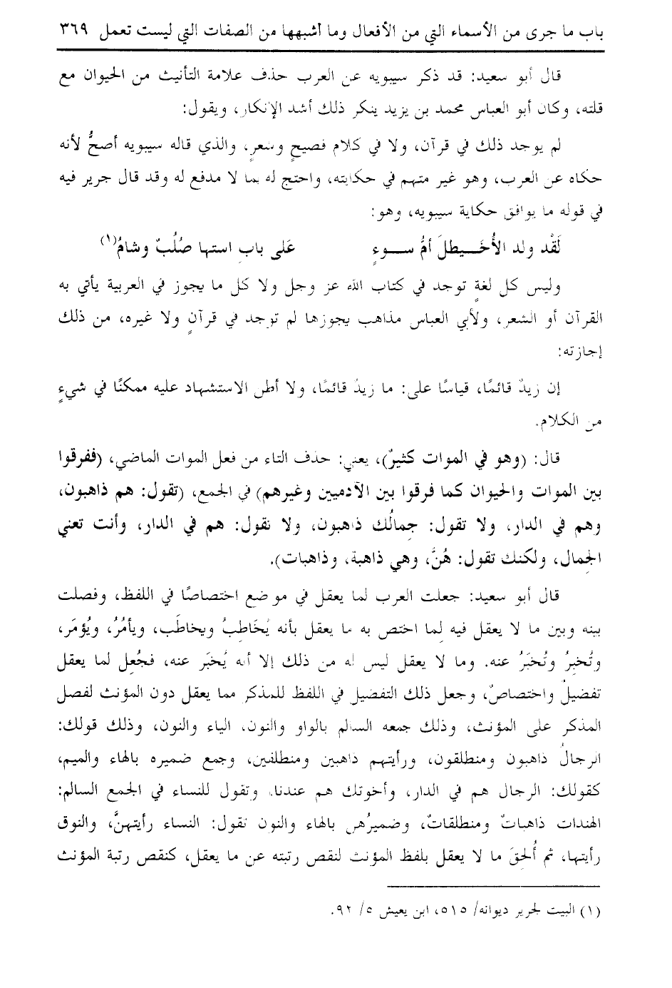 قال أبو سعيد: قد ذكر سيبويه عن العرب حذف علامة التأنيث من الحيوان مع قلته، وكان أبو العباس محمد بن يزيد ينكر ذلك أشد الإنكار، ويقول:
