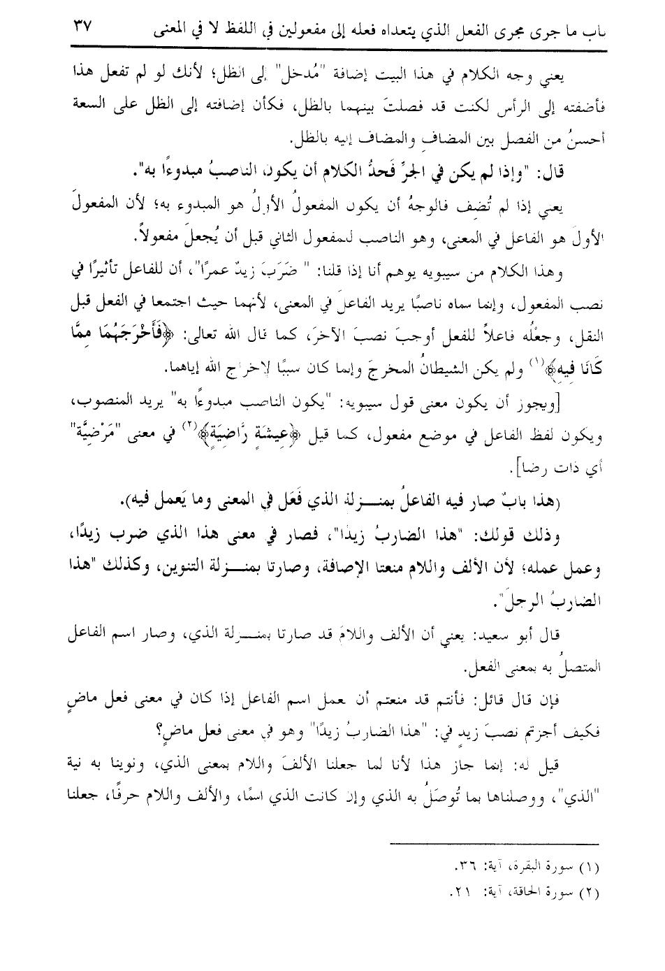 وهذا الكلام من سيبويه يوهم أنا إذا قلنا: " ضرب زيد عمرا "، أن للفاعل تأثيرا في نصب المفعول، وإنما سماه ناصبا يريد الفاعل في المعنى، لأنهما حيث اجتمعا في الفعل قبل النقل، وجعله فاعلا للفعل أوجب نصب الآخر، كما قال الله تعالى: فَأَخْرَجَهُما مِمَّا كانا فِيهِ (¬1) ولم يكن الشيطان المخرج وإنما كان سببا لإخراج الله إياهما.
