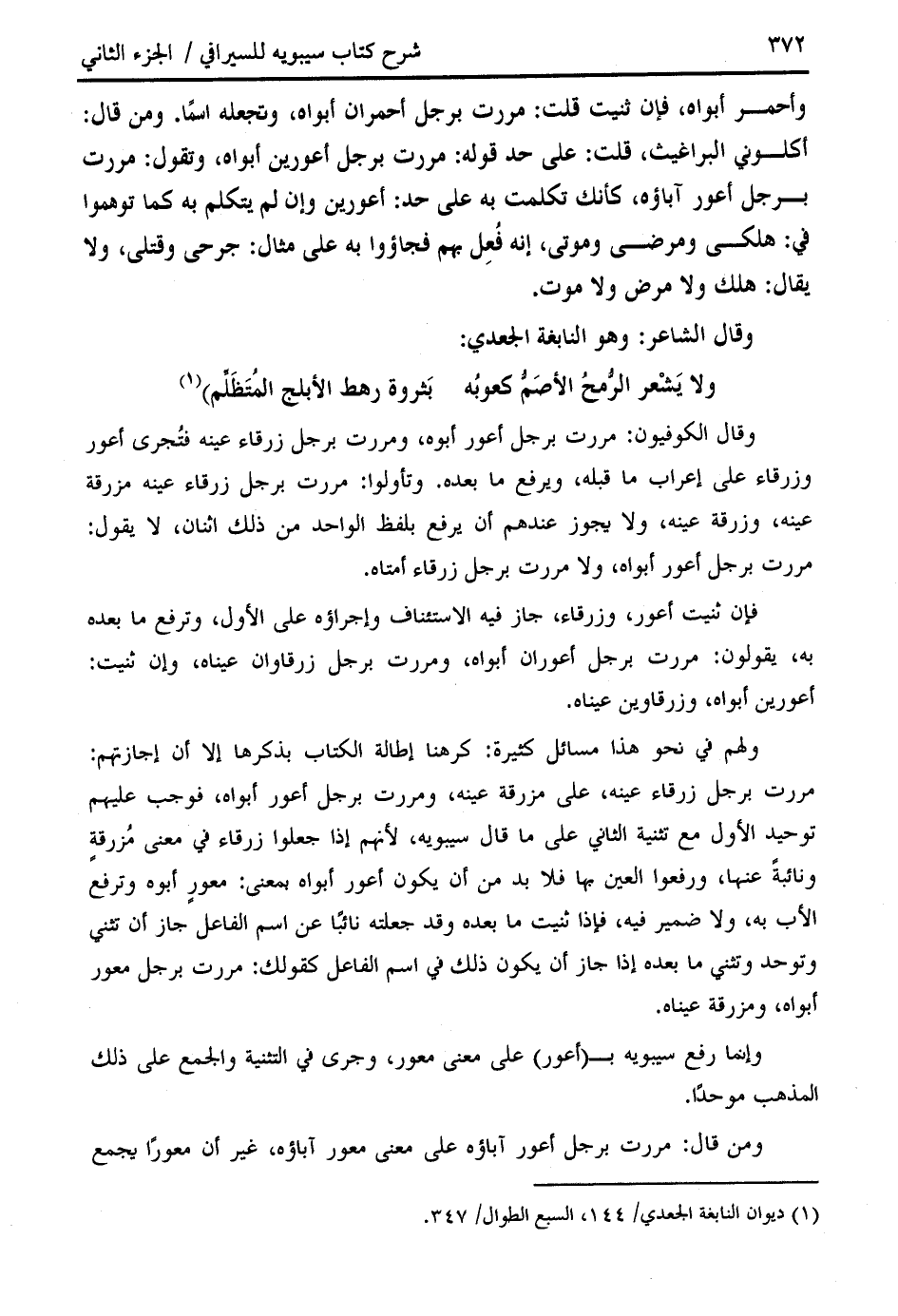 وإنما رفع سيبويه ب (أعور) على معنى معور، وجرى في التثنية والجمع على ذلك المذهب موحدا.