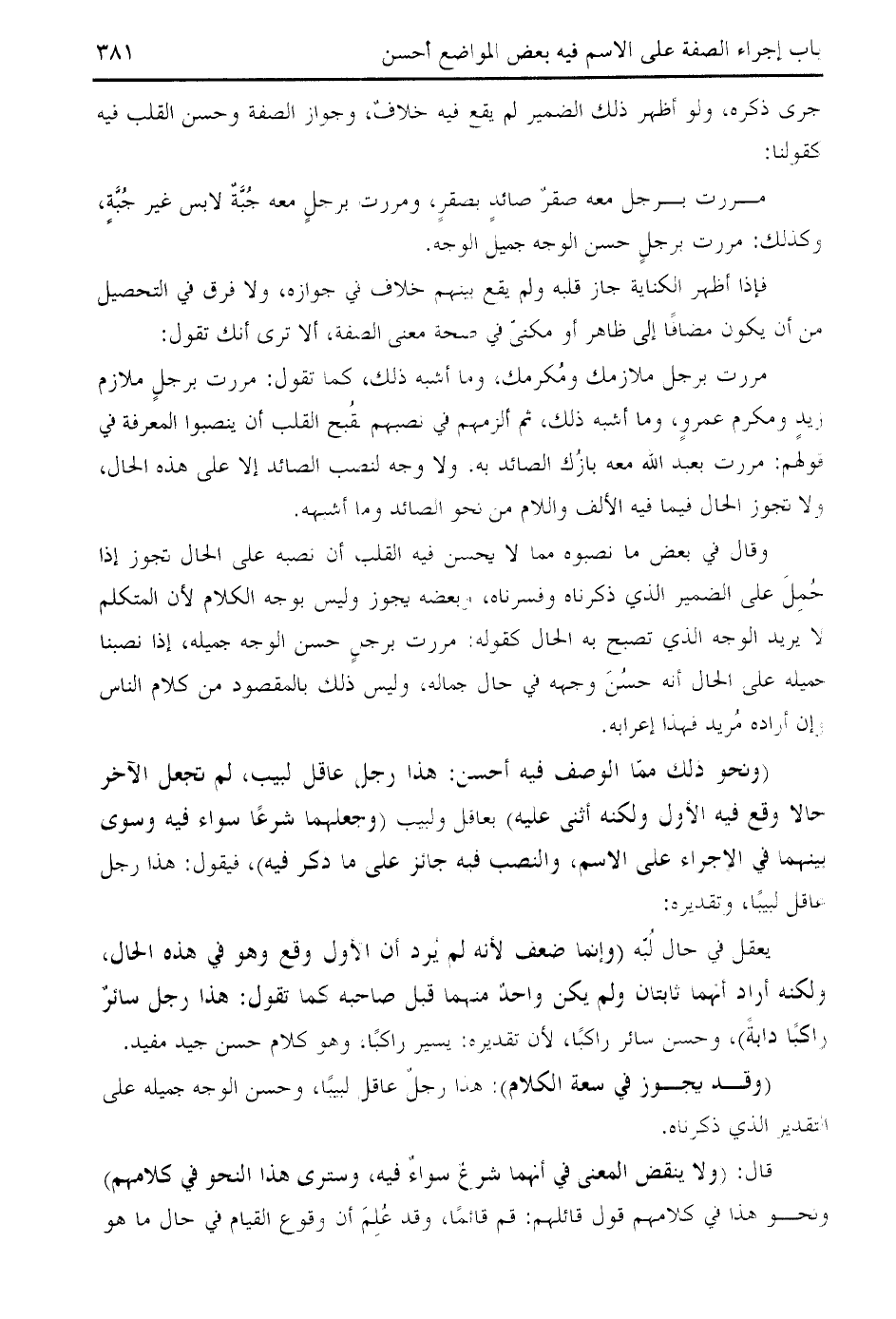 وقال في بعض ما نصبوه مما لا يحسن فيه القلب أن نصبه على الحال تجوز إذا حمل على الضمير الذي ذكرناه وفسرناه، وبعضه يجوز وليس بوجه الكلام لأن المتكلم لا يريد الوجه الذي تصبح به الحال كقوله: مررت برجل حسن الوجه جميله، إذا نصبنا جميله على الحال أنه حسن وجهه في حال جماله، وليس ذلك بالمقصود من كلام الناس وإن أراده مريد فهذا إعرابه.