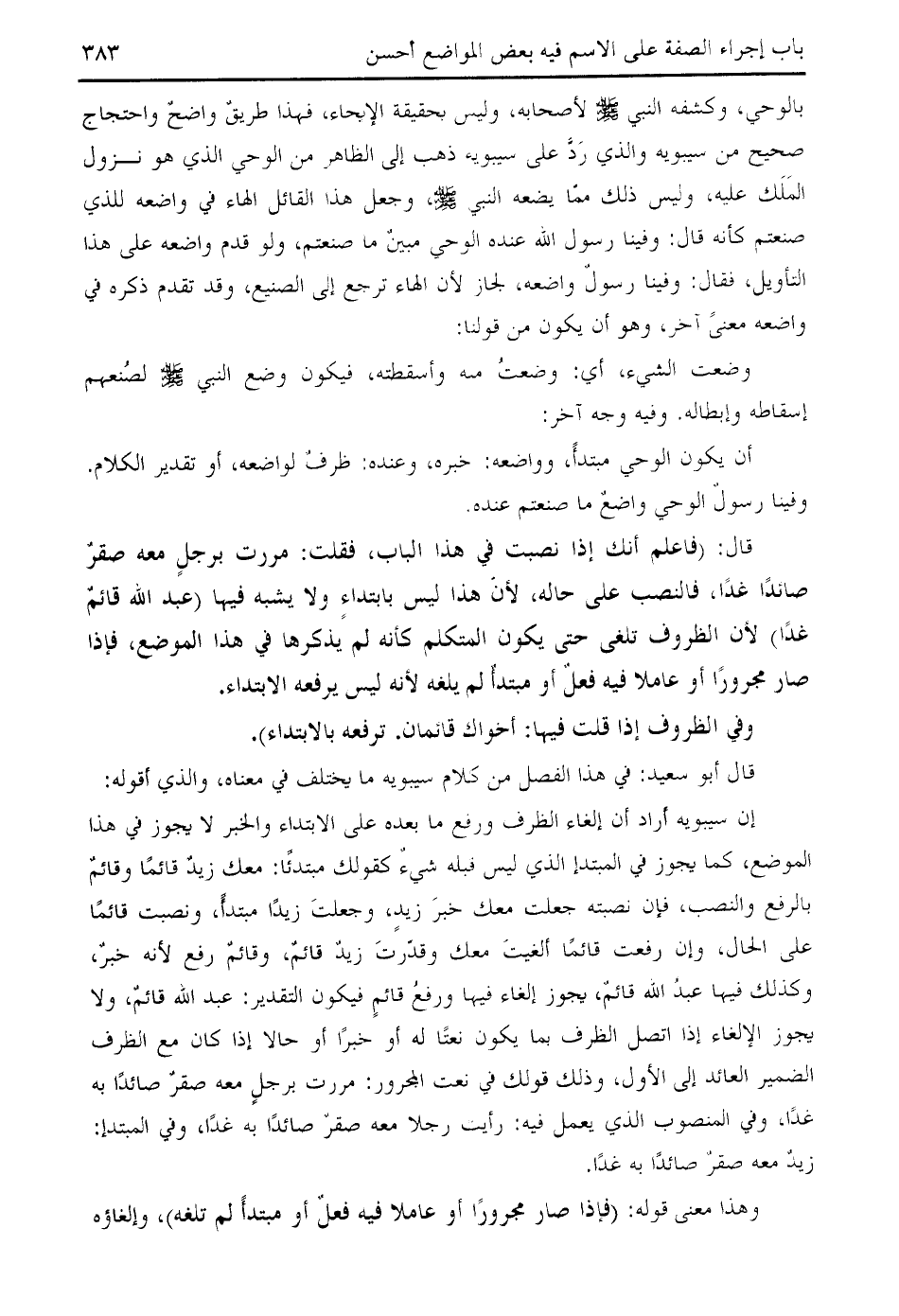 إن سيبويه أراد أن إلغاء الظرف ورفع ما بعده على الابتداء والخبر لا يجوز في هذا الموضع، كما يجوز في المبتدإ الذي ليس قبله شيء كقولك مبتدئا: معك زيد قائما وقائم بالرفع والنصب، فإن نصبته جعلت معك خبر زيد، وجعلت زيدا مبتدأ، ونصبت قائما على الحال، وإن رفعت قائما ألغيت معك وقدّرت زيد قائم، وقائم رفع لأنه خبر، وكذلك فيها عبد الله قائم، يجوز إلغاء فيها ورفع قائم فيكون التقدير: عبد الله قائم، ولا يجوز الإلغاء إذا اتصل الظرف بما يكون نعتا له أو خبرا أو حالا إذا كان مع الظرف الضمير العائد إلى الأول، وذلك قولك في نعت المجرور: مررت برجل معه صقر صائدا به غدا، وفي المنصوب الذي يعمل فيه: رأيت رجلا معه صقر صائدا به غدا، وفي المبتدإ: