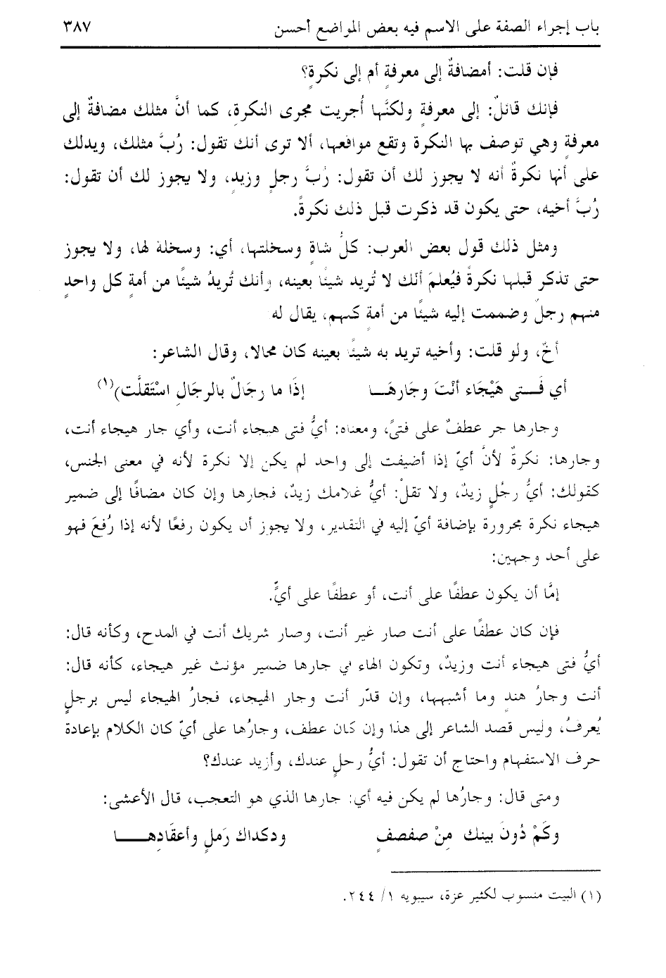 فإنك قائل: إلى معرفة ولكنّها أجريت مجرى النكرة، كما أنّ مثلك مضافة إلى معرفة وهي توصف بها النكرة وتقع مواقعها، ألا ترى أنك تقول: ربّ مثلك، ويدلك على أنها نكرة أنه لا يجوز لك أن تقول: ربّ رجل وزيد، ولا يجوز لك أن تقول: