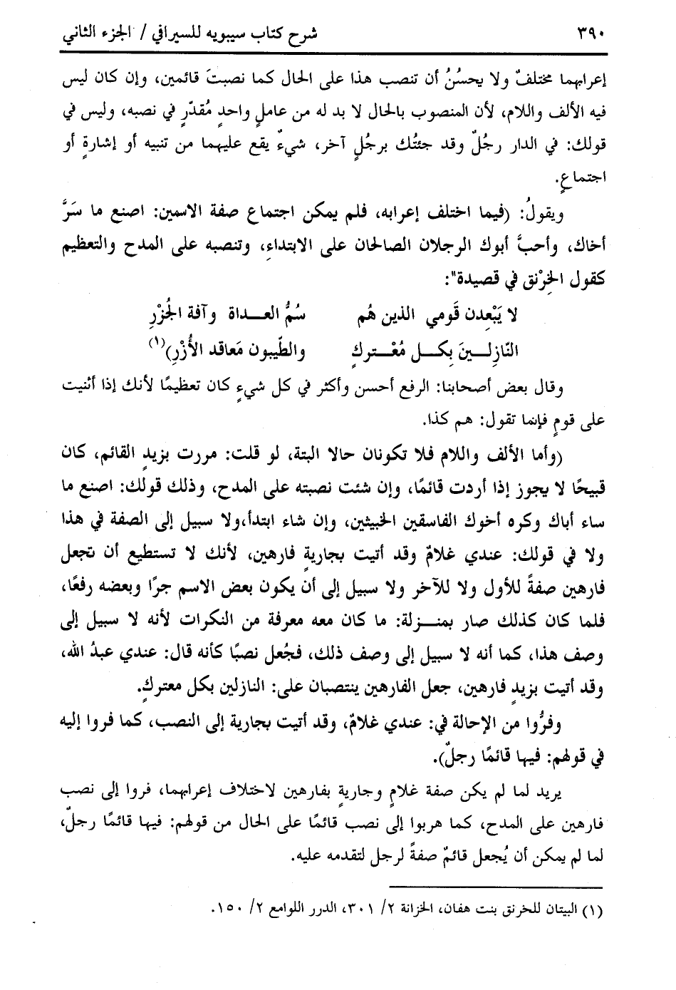 (وأما الألف واللام فلا تكونان حالا البتة، لو قلت: مررت بزيد القائم، كان قبيحا لا يجوز إذا أردت قائما، وإن شئت نصبته على المدح، وذلك قولك: اصنع ما ساء أباك وكره أخوك الفاسقين الخبيثين، وإن شاء ابتدأ، ولا سبيل إلى الصفة في هذا ولا في قولك: عندي غلام وقد أتيت بجارية فارهين، لأنك لا تستطيع أن تجعل فارهين صفة للأول ولا للآخر ولا سبيل إلى أن يكون بعض الاسم جرا وبعضه رفعا، فلما كان كذلك صار بمنزلة: ما كان معه معرفة من النكرات لأنه لا سبيل إلى وصف هذا، كما أنه لا سبيل إلى وصف ذلك، فجعل نصبا كأنه قال: عندي عبد الله، وقد أتيت بزيد فارهين، جعل الفارهين ينتصبان على: النازلين بكل معترك.