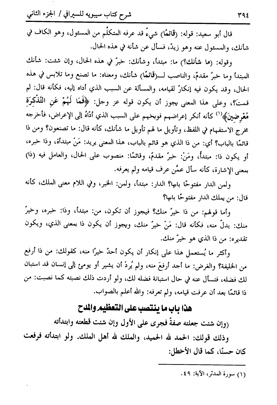 وقوله: (ما شأنك؟) ما: مبتدأ، وشأنك: خبر في هذه الحال، وإن شئت: شأنك المبتدأ وما خبر مقدم، والناصب ل (قائما) شأنك، ومعناه: ما تصنع وما تلابس في هذه الحال، وقد يكون فيه إنكار لقيامه، والمسألة عن السبب الذي أداه إليه، فكأنه قال: لم قمت؟، وعلى هذا المعنى يجوز أن يكون قوله عز وجل: فَما لَهُمْ عَنِ التَّذْكِرَةِ مُعْرِضِينَ (¬1) كأنه أنكر إعراضهم فوبخهم على السبب الذي أدّاه إلى الإعراض، فأخرجه مخرج الاستفهام في اللفظ، وتأويل ما لهم تأويل ما شأنك، كأنه قال: ما تصنعون؟ ومن ذا قائما بالباب؟ أي: من ذا الذي هو قائم بالباب، هذا المعنى يريد: من مبتدأة، وذا خبره، أو يكون ذا: مبتدأ، ومن: خبر مقدم، وقائما: منصوب على الحال، والعامل فيه (ذا) بمعنى الإشارة، كأنه سأل عمّن عرف قيامه ولم يعرفه.