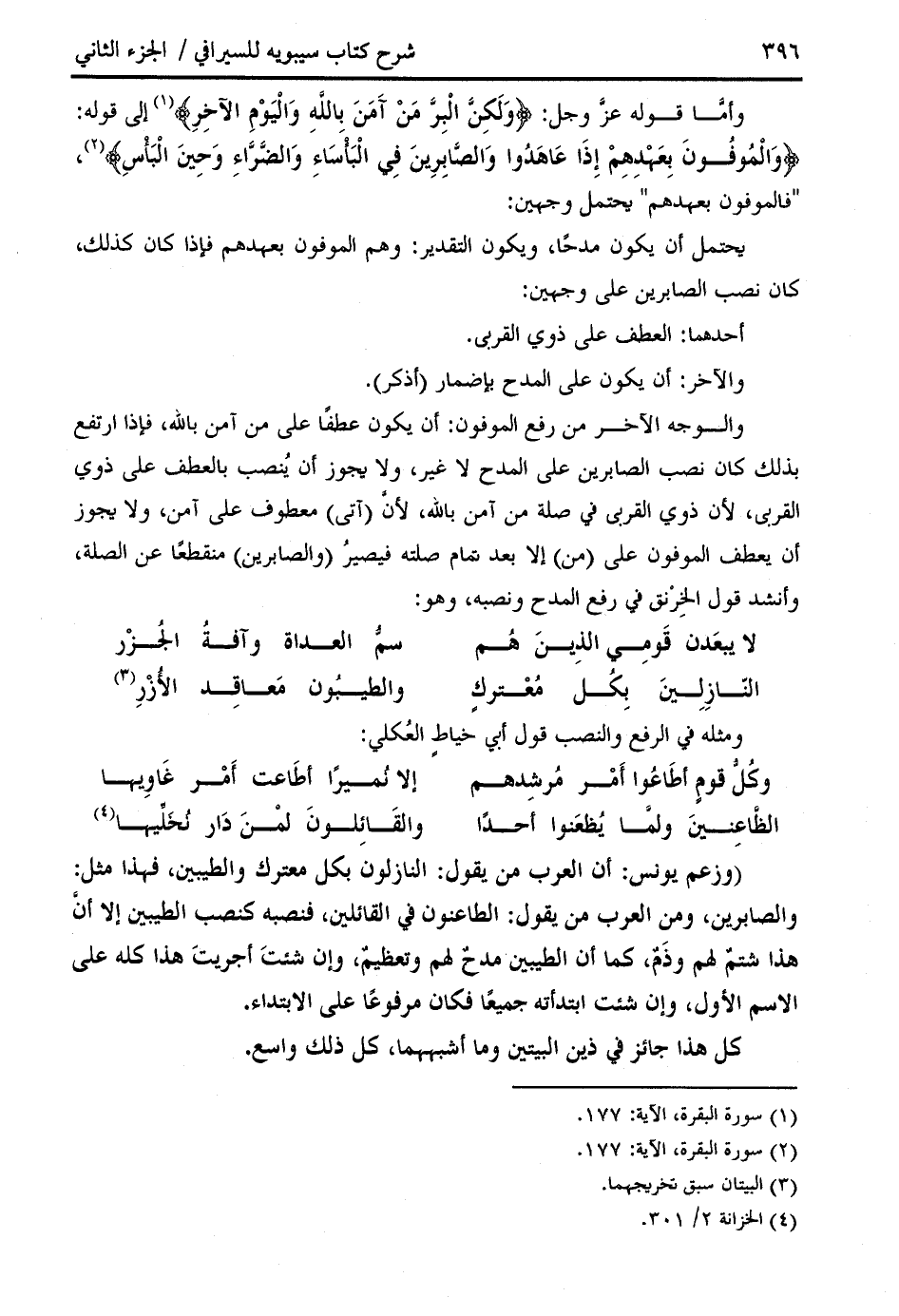 والوجه الآخر من رفع الموفون: أن يكون عطفا على من آمن بالله، فإذا ارتفع بذلك كان نصب الصابرين على المدح لا غير، ولا يجوز أن ينصب بالعطف على ذوي القربى، لأن ذوي القربى في صلة من آمن بالله، لأنّ (آتى) معطوف على آمن، ولا يجوز أن يعطف الموفون على (من) إلا بعد تمام صلته فيصير (والصابرين) منقطعا عن الصلة، وأنشد قول الخرنق في رفع المدح ونصبه، وهو: