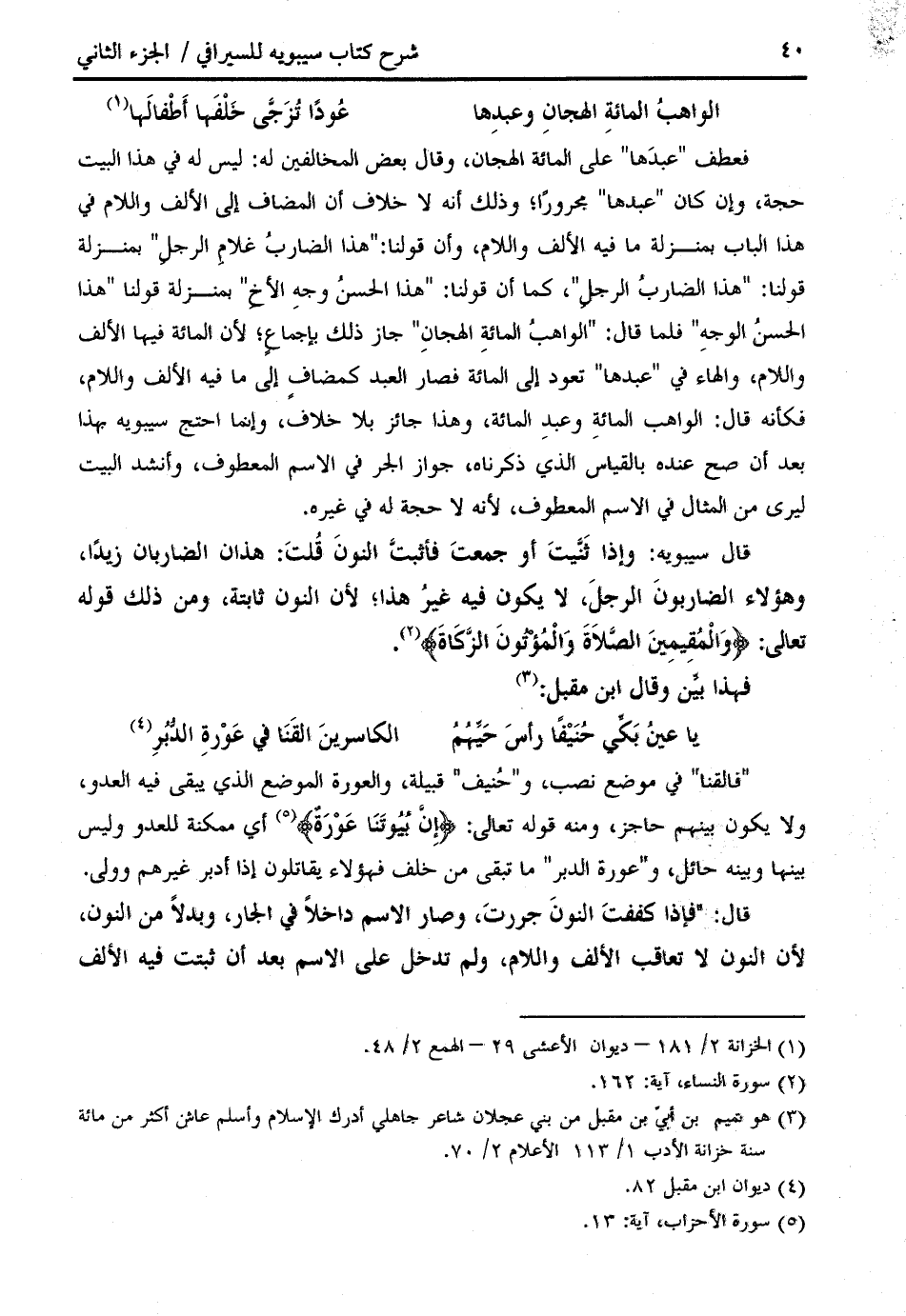 فعطف " عبدها " على المائة الهجان، وقال بعض المخالفين له: ليس له في هذا البيت حجة، وإن كان " عبدها " مجرورا؛ وذلك أنه لا خلاف أن المضاف إلى الألف واللام في هذا الباب بمنزلة ما فيه الألف واللام، وأن قولنا: " هذا الضارب غلام الرجل " بمنزلة قولنا: " هذا الضارب الرجل "، كما أن قولنا: " هذا الحسن وجه الأخ " بمنزلة قولنا "