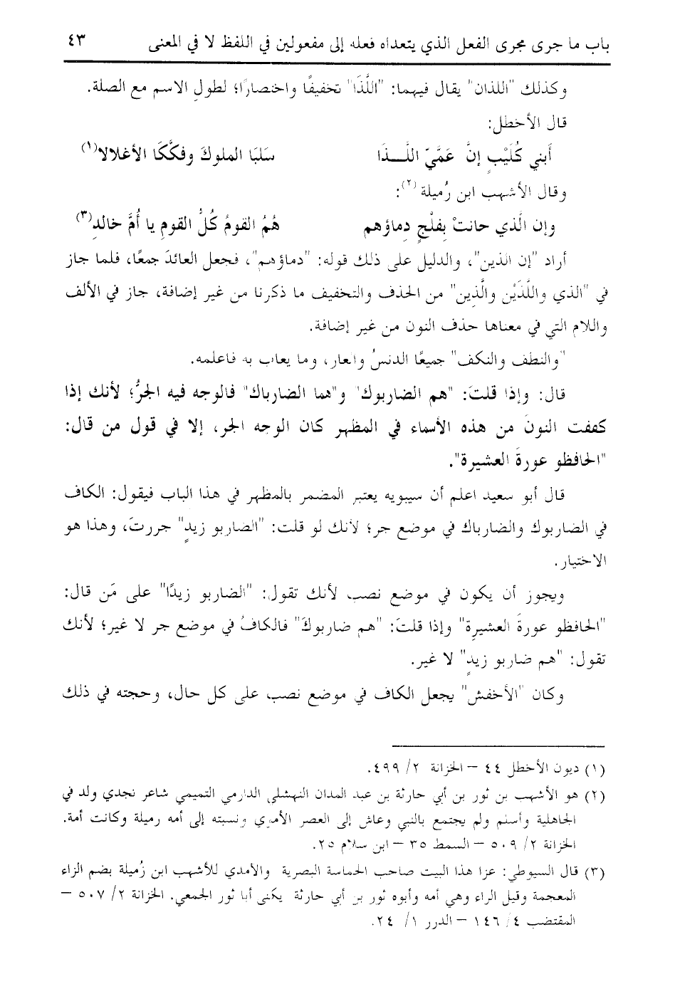 (¬3) قال السيوطي: عزا هذا البيت صاحب الحماسة البصرية والآمدي للأشهب ابن زميلة بضم الزاء المعجمة وقيل الراء وهي أمه وأبوه ثور بن أبي حارثة يكنى أبا ثور الجمعي. الخزانة 2/ 507 - المقتضب 4/ 146 - الدرر 1/ 24.
