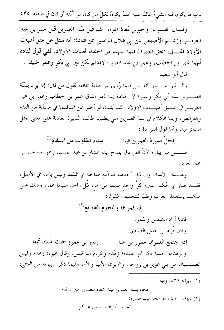وقال الفرّاء: وأخبرني معاذ الهراء: لقد قيل سنّة العمرين قبل عمر بن عبد العزيز وزعم الأصمعي عن أبي هلال الراسبي عن قتادة: أنه سئل عن عتق أمهات الأولاد فقال: أعتق العمران فيما بينهما من الخلفاء أمهات الأولاد، ففي