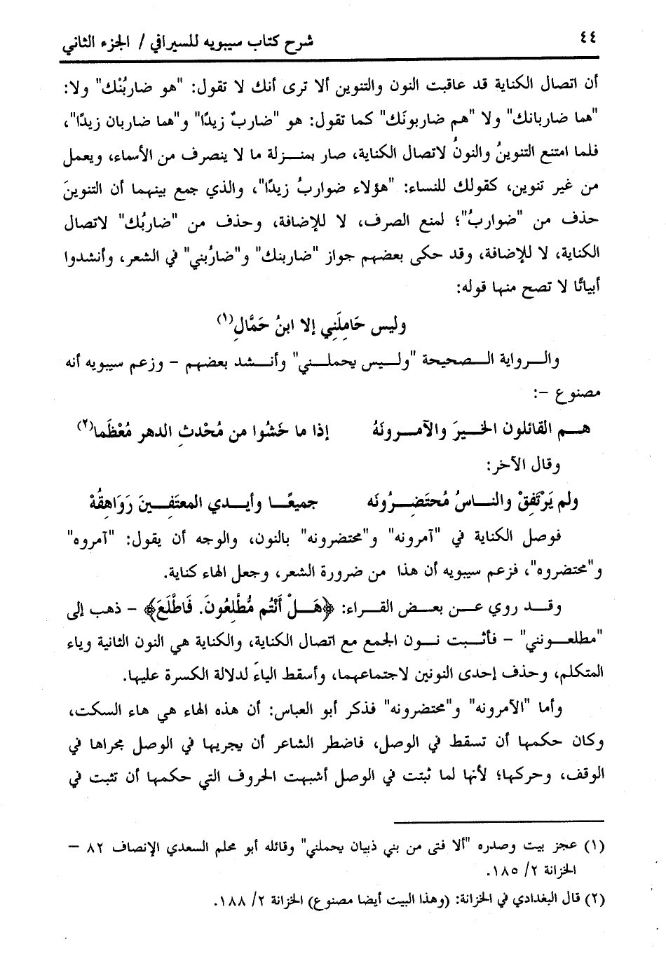 فوصل الكناية في " آمرونه " و " محتضرونه " بالنون، والوجه أن يقول: " آمروه " و " محتضروه "، فزعم سيبويه أن هذا من ضرورة الشعر، وجعل الهاء كناية.